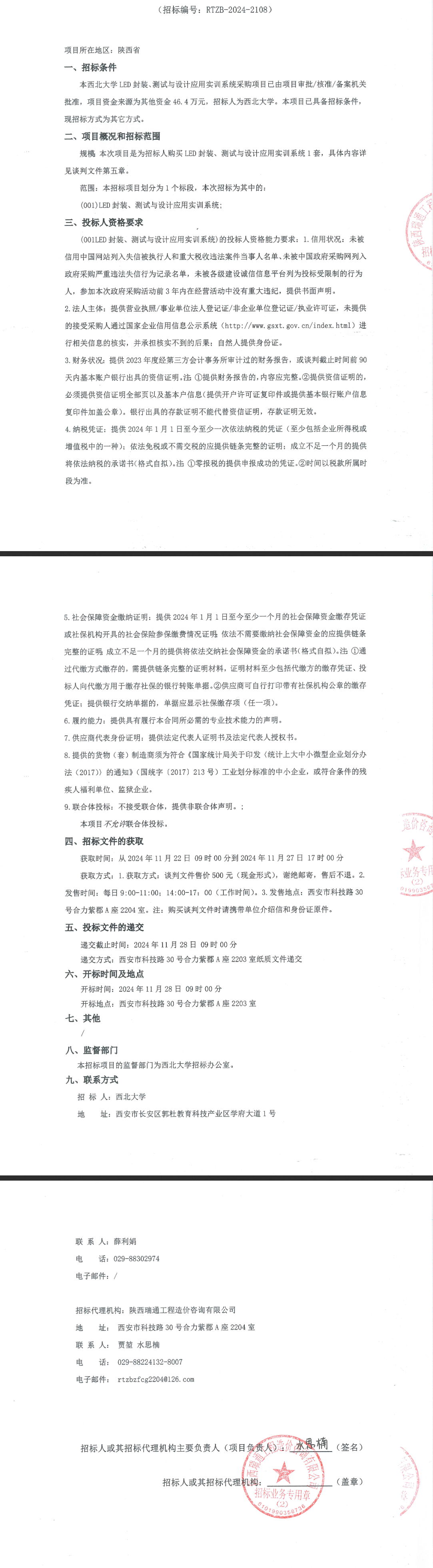 西北大学LED封装、测试与设计应用实训系统采购项目竞争性谈判公告 作者: 编辑:薛利娟 时间:2024-11-22 原公告链接:http://bulletin.sntba.com/biddingBulletin/2024-11-22/1987789.html