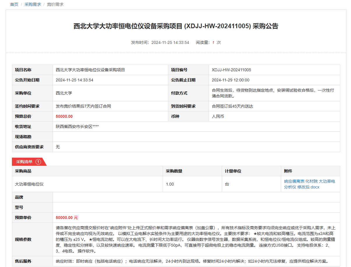 西北大学大功率恒电位仪设备采购项目(XDJJ-HW-202411005)竞价采购公告 作者:采购与招标办公室 编辑: 时间:2024-11-25 原公告链接:https://www.ejingcai.com.cn/site/bidding/detail/15327