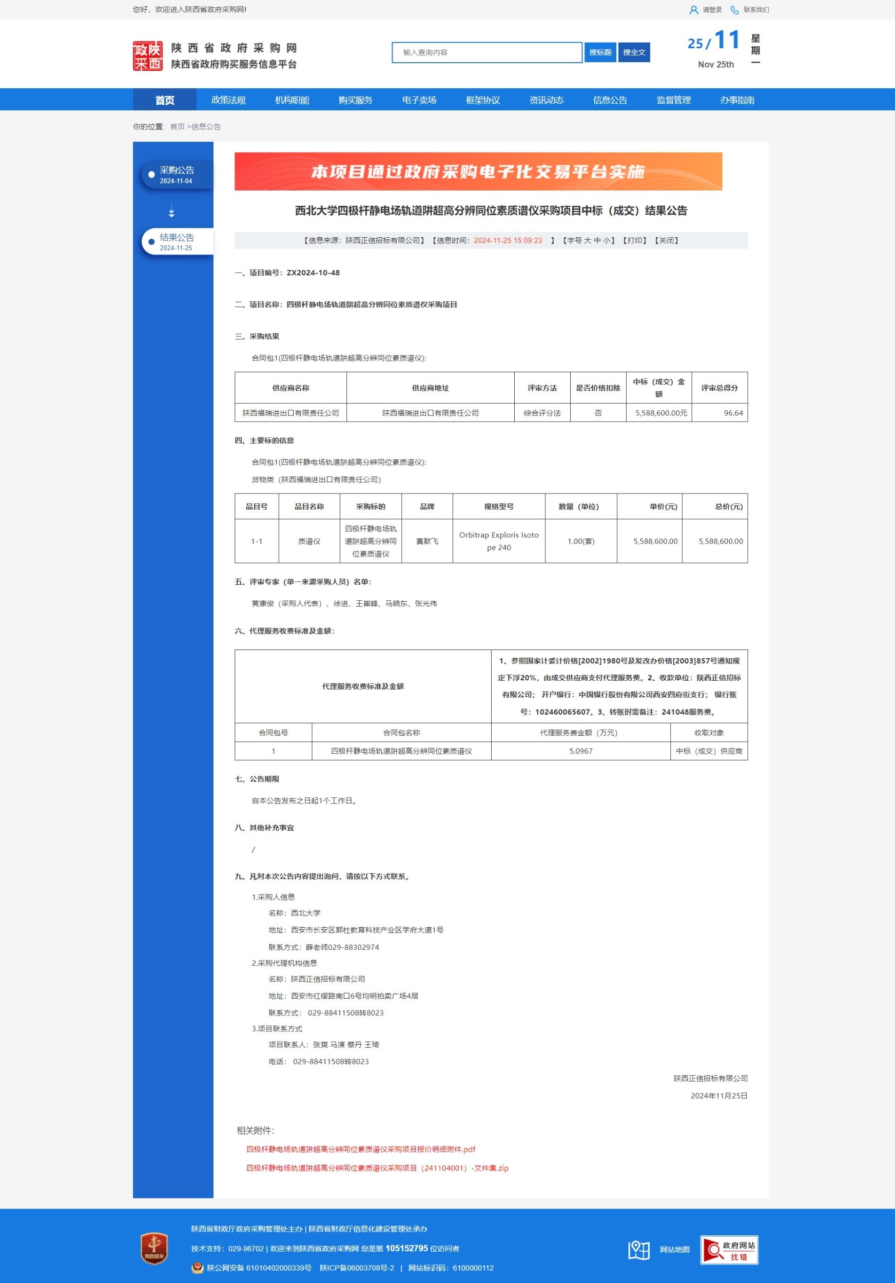 西北大学四极杆静电场轨道阱超高分辨同位素质谱仪采购项目中标(成交)结果公告 作者: 编辑:薛利娟 时间:2024-11-25 原公告链接:https://www.ccgp-shaanxi.gov.cn/freecms/site/shaanxi/ggxx/info/2024/8a69c251921857370193621d18161261.html?noticeType=001021¬iceId=c9515c7f-aafd-11ef-8063-08c0eb20c666