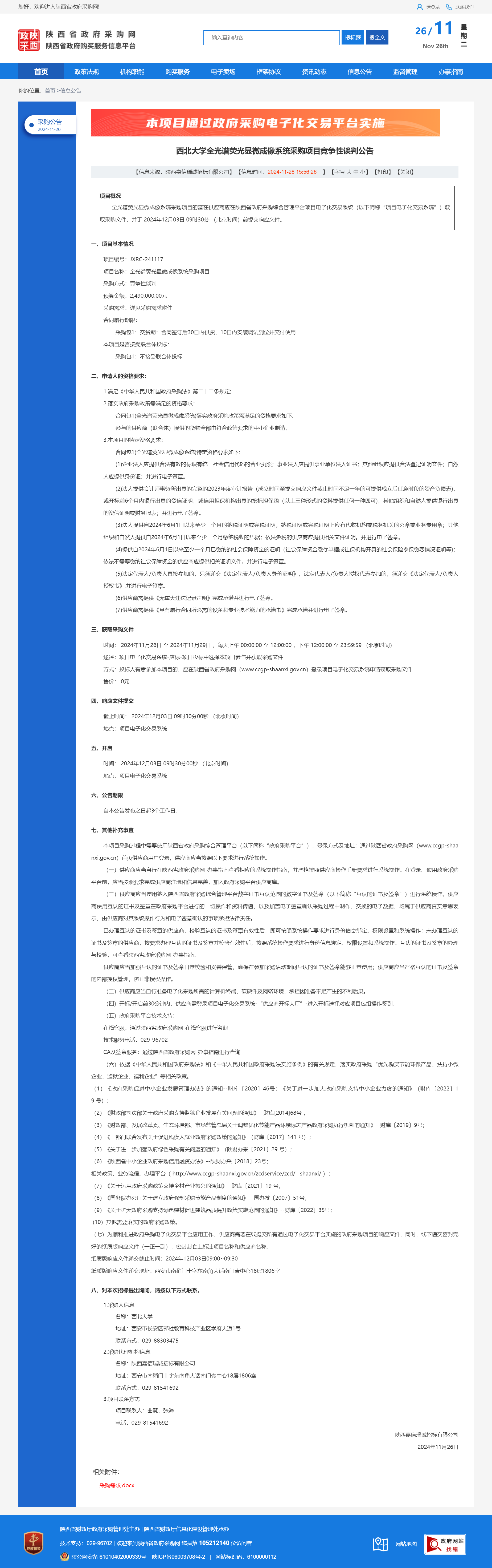 西北大学全光谱荧光显微成像系统采购项目竞争性谈判公告 作者:采购与招标办公室 编辑: 时间:2024-11-26 原公告链接:https://www.ccgp-shaanxi.gov.cn/freecms/site/shaanxi/ggxx/info/2024/8a69c95d921859f001936768d6964ed3.html?noticeType=001013¬iceId=86c4a750-abcd-11ef-8063-08c0eb20c666