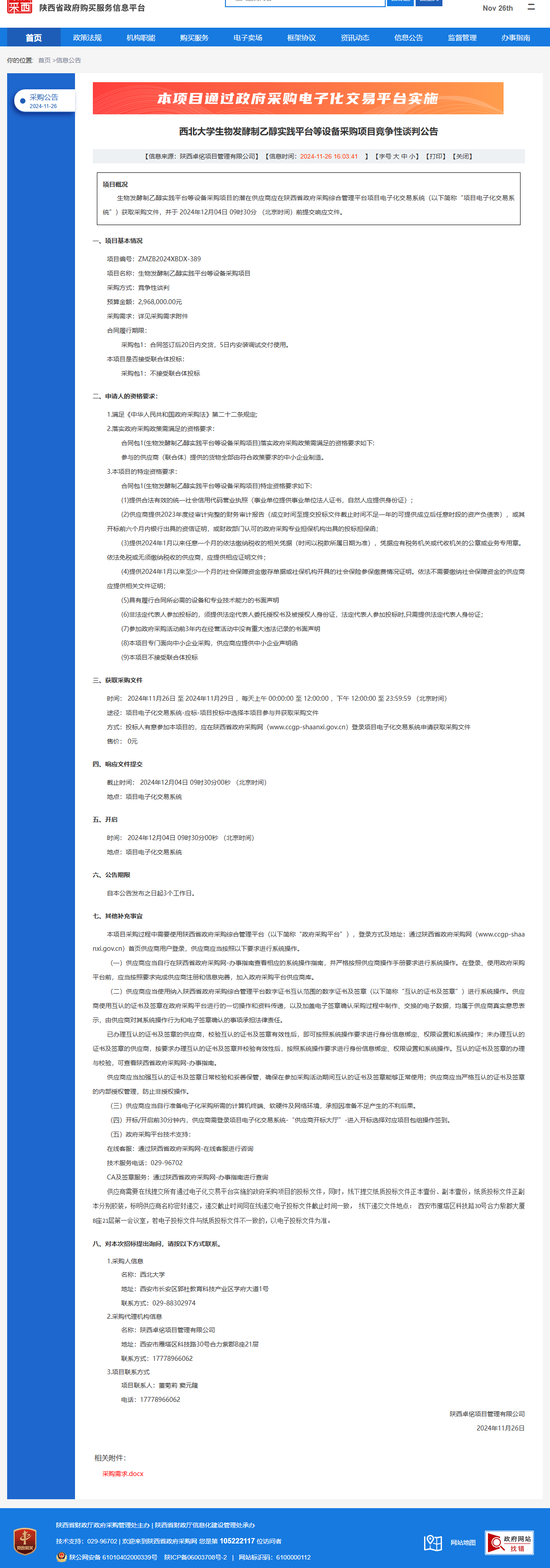 西北大学生物发酵制乙醇实践平台等设备采购项目竞争性谈判公告 作者:采购与招标办公室 编辑: 时间:2024-11-26 原公告链接:https://www.ccgp-shaanxi.gov.cn/freecms/site/shaanxi/ggxx/info/2024/8a69c95d921859f0019365f6c5e47f67.html?noticeType=001013¬iceId=8a2ac2c3-abce-11ef-8063-08c0eb20c666