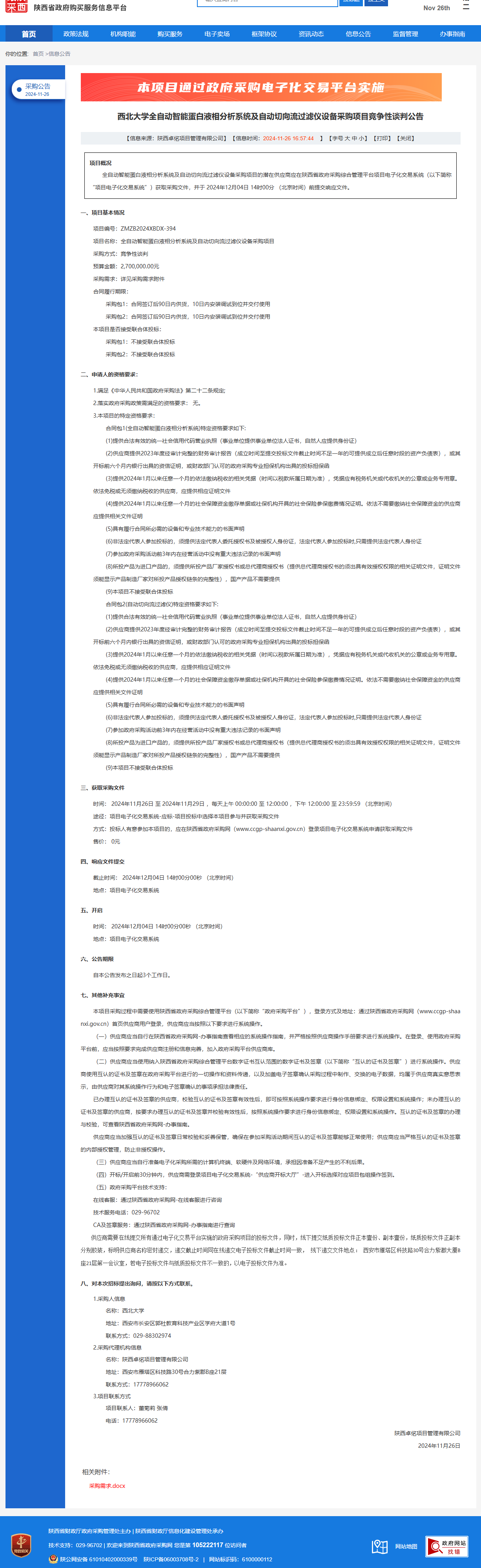 西北大学全自动智能蛋白液相分析系统及自动切向流过滤仪设备采购项目竞争性谈判公告 作者:采购与招标办公室 编辑: 时间:2024-11-26 原公告链接:https://www.ccgp-shaanxi.gov.cn/freecms/site/shaanxi/ggxx/info/2024/8a69c5a59218576d01936775f5d97931.html?noticeType=001013¬iceId=17632152-abd6-11ef-8063-08c0eb20c666