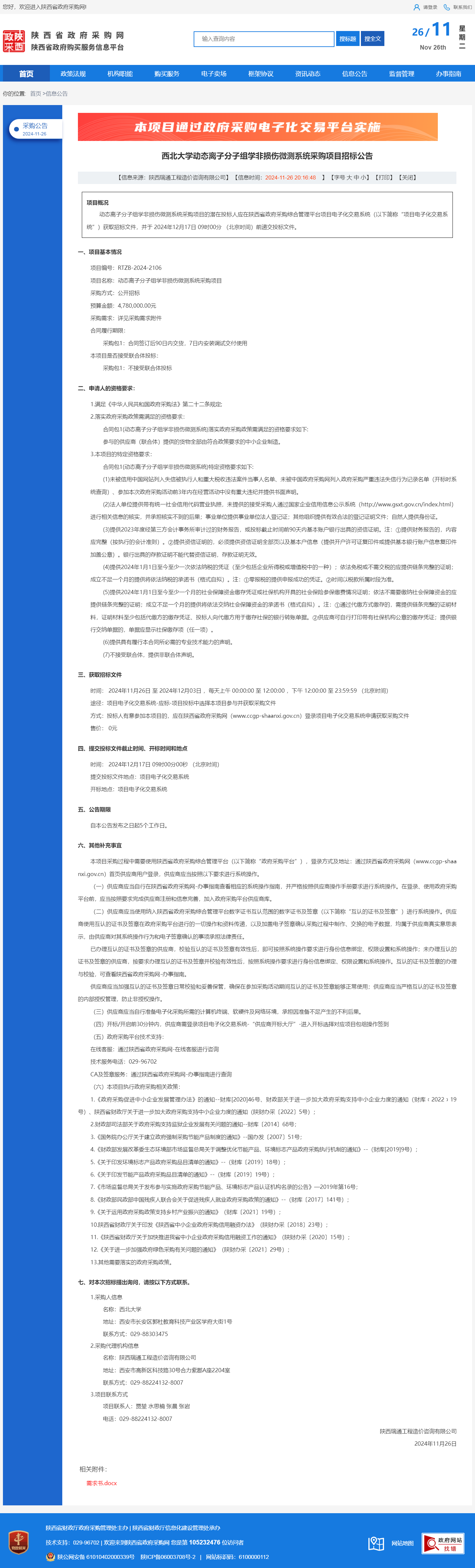 西北大学动态离子分子组学非损伤微测系统采购项目招标公告 作者:采购与招标办公室 编辑: 时间:2024-11-26 原公告链接:http://www.ccgp-shaanxi.gov.cn/freecms/site/shaanxi/ggxx/info/2024/8a69c95d921859f00193685d31243738.html?noticeType=001011¬iceId=e6602f79-abf1-11ef-8063-08c0eb20c666