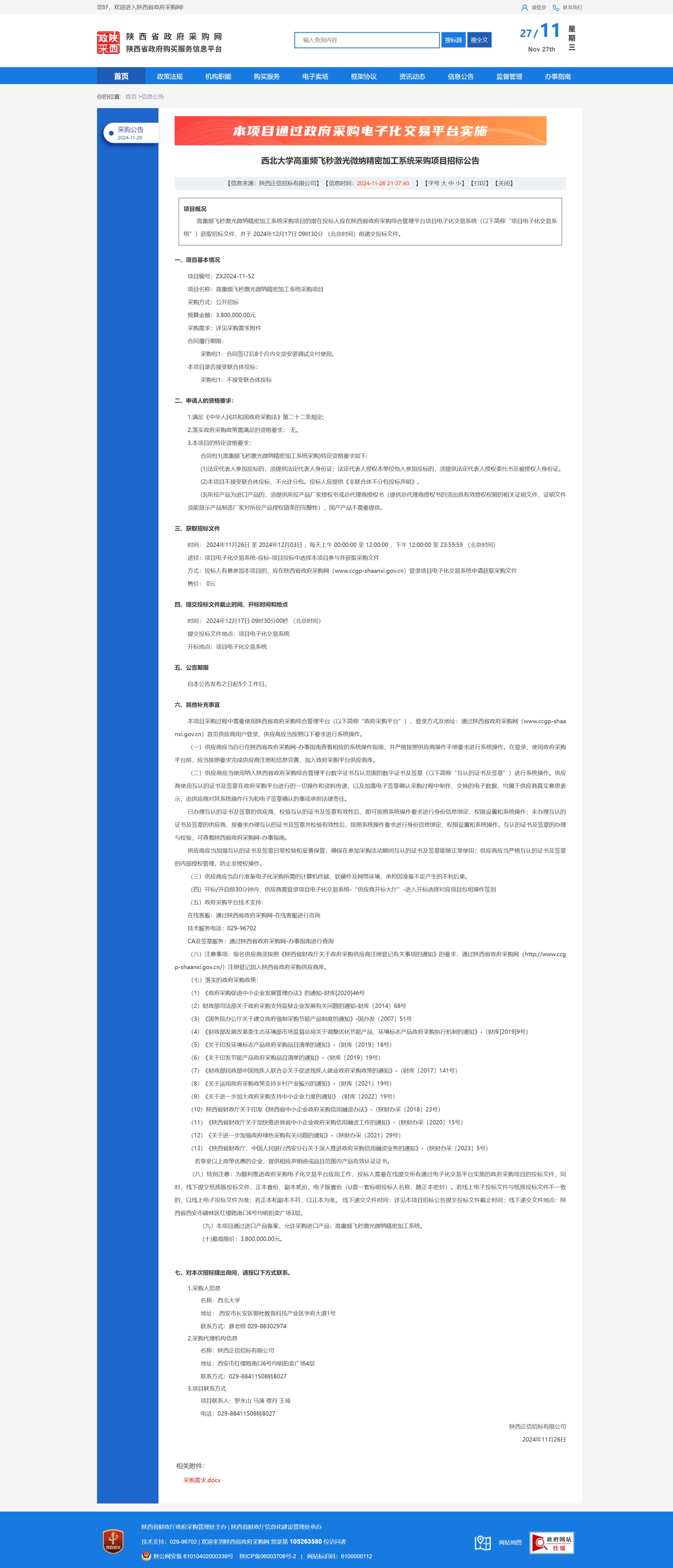 西北大学高重频飞秒激光微纳精密加工系统采购项目招标公告 作者: 编辑:薛利娟 时间:2024-11-27 原公告链接:https://www.ccgp-shaanxi.gov.cn/freecms/site/shaanxi/ggxx/info/2024/8a69c5a59218576d0193689b9b175d98.html?noticeType=001011¬iceId=32a5eef2-abfd-11ef-8063-08c0eb20c666