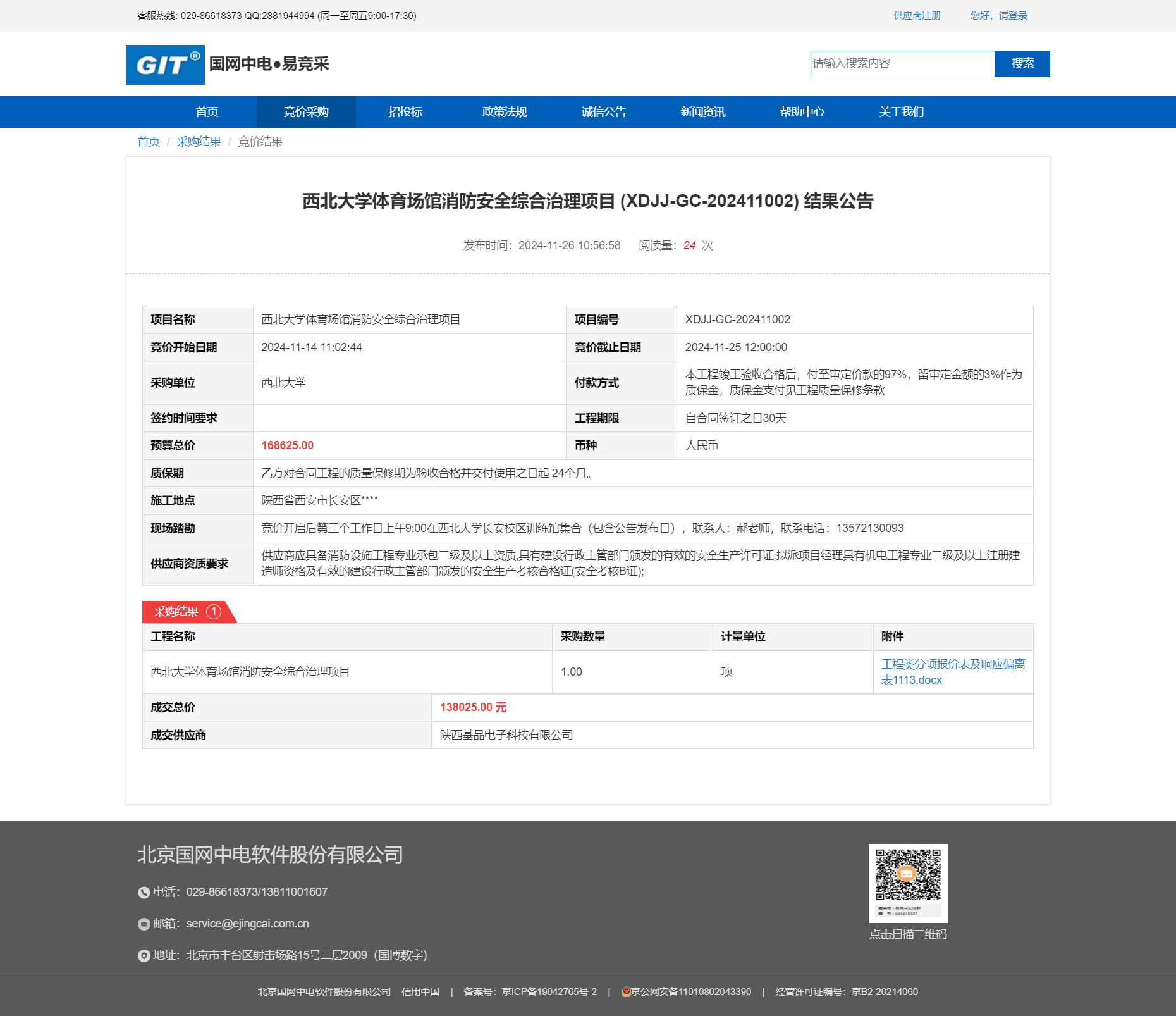 西北大学体育场馆消防安全综合治理项目 (XDJJ-GC-202411002) 结果公告