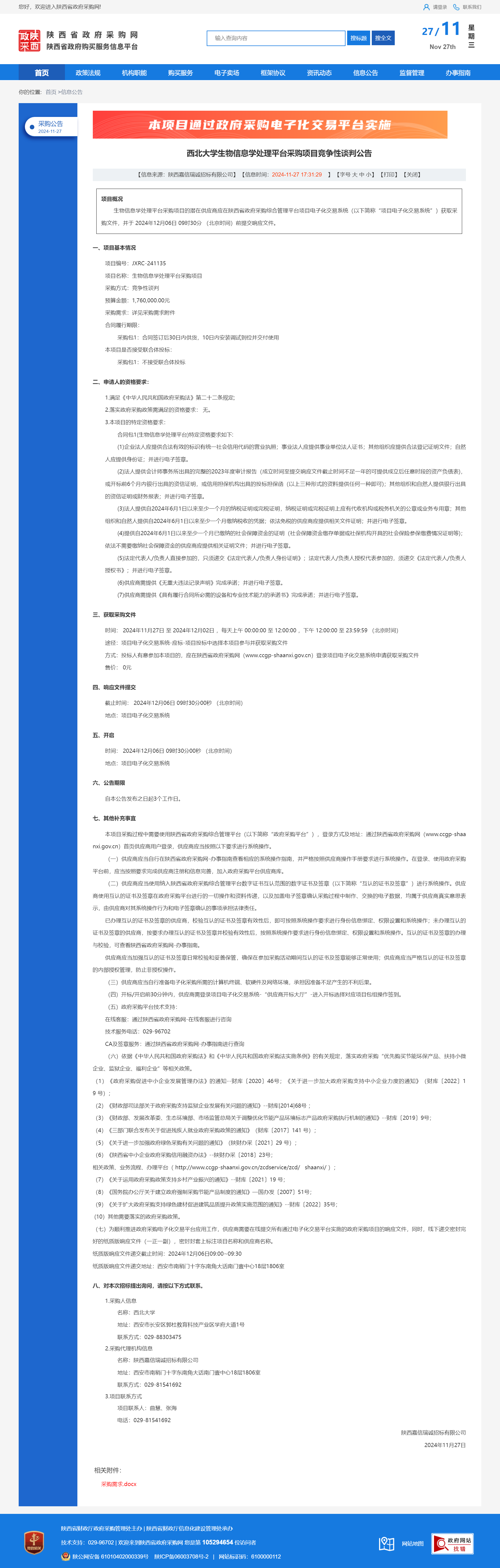 西北大学生物信息学处理平台采购项目竞争性谈判公告 作者:采购与招标办公室 编辑: 时间:2024-11-27 原公告链接:https://www.ccgp-shaanxi.gov.cn/freecms/site/shaanxi/ggxx/info/2024/8a69c2519218573701936ce159174448.html?noticeType=001013¬iceId=f93e2324-aca3-11ef-8063-08c0eb20c666