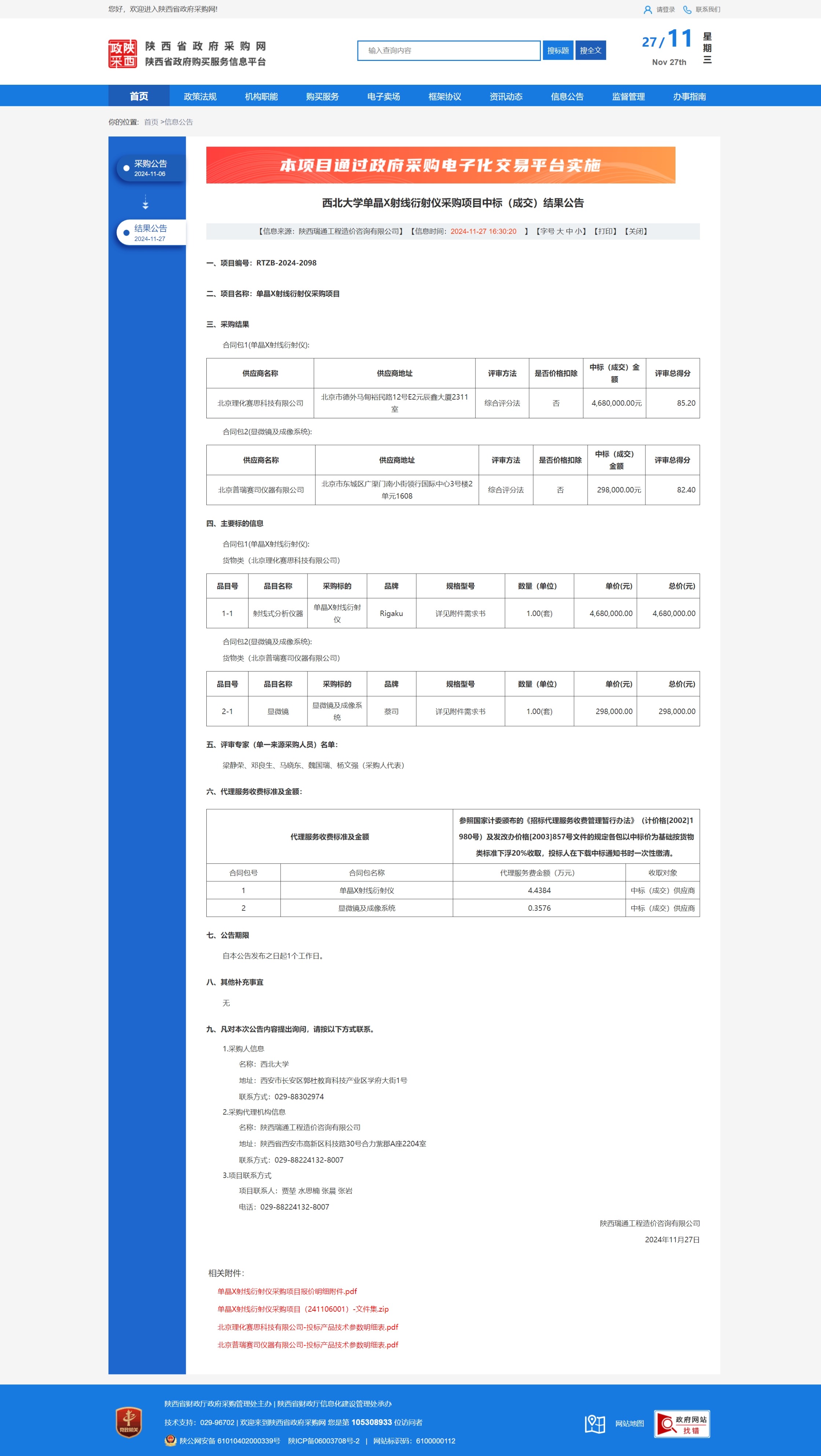 西北大学单晶X射线衍射仪采购项目中标(成交)结果公告 作者: 编辑:薛利娟 时间:2024-11-27 原公告链接:https://www.ccgp-shaanxi.gov.cn/freecms/site/shaanxi/ggxx/info/2024/8a69c2519218573701936c9dc8b83cb3.html?noticeType=001021¬iceId=6e7a9363-ac9b-11ef-8063-08c0eb20c666