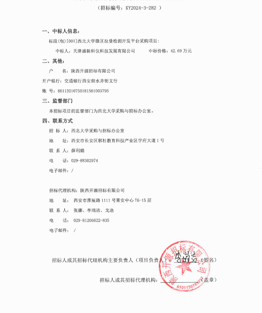 西北大学微区拉曼检测开发平台采购项目成交公告 作者: 编辑:薛利娟 时间:2024-11-28 原公告链接:http://bulletin.sntba.com/resultBulletin/2024-11-28/1990304.html
