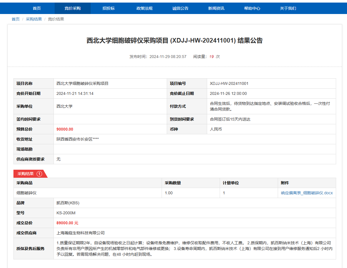 西北大学细胞破碎仪采购项目(XDJJ-HW-202411001)竞价结果公告 作者:采购与招标办公室 编辑: 时间:2024-11-29 原公告链接:https://www.ejingcai.com.cn/site/bidding/detail/15477