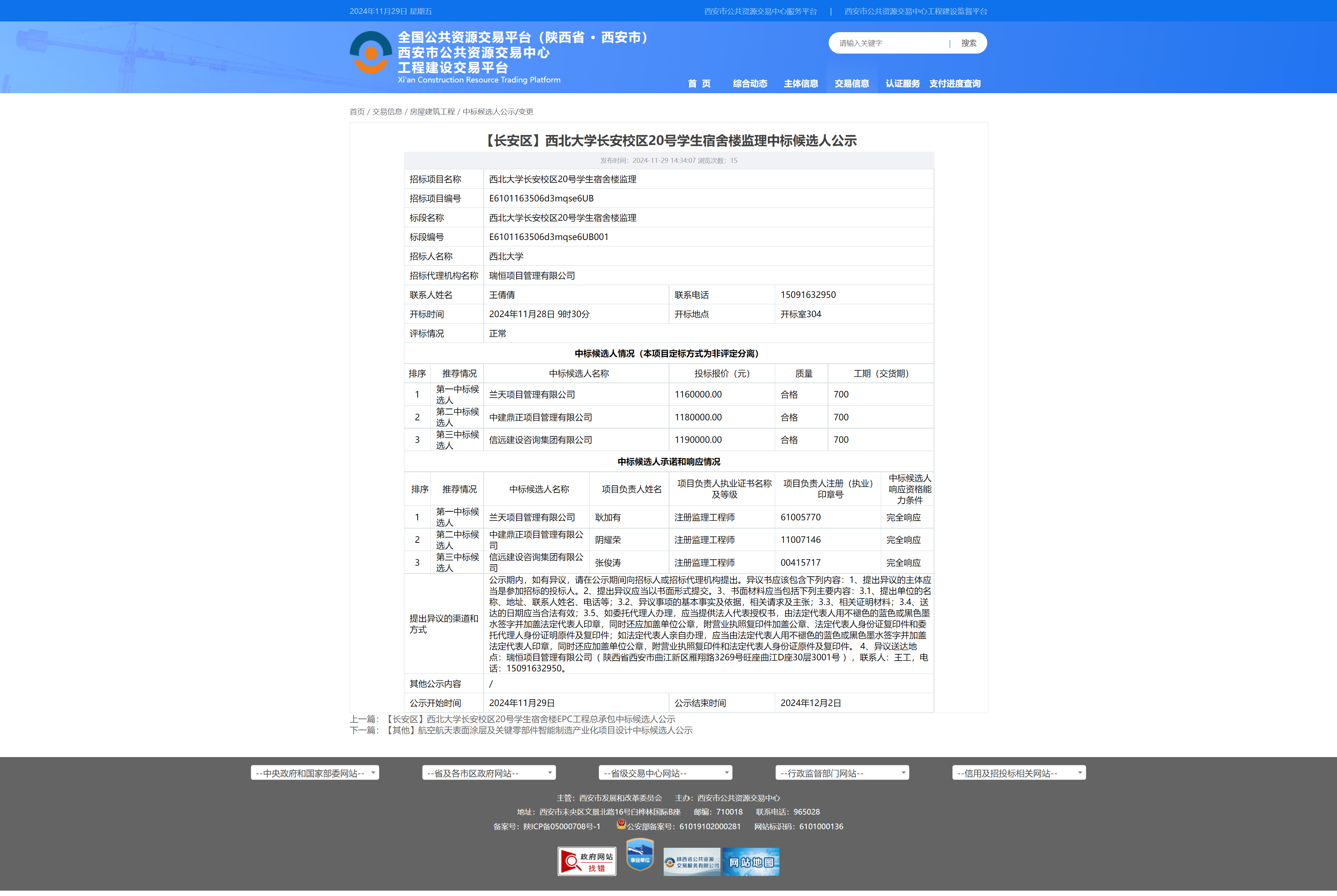 西北大学长安校区20号学生宿舍楼监理中标候选人公示