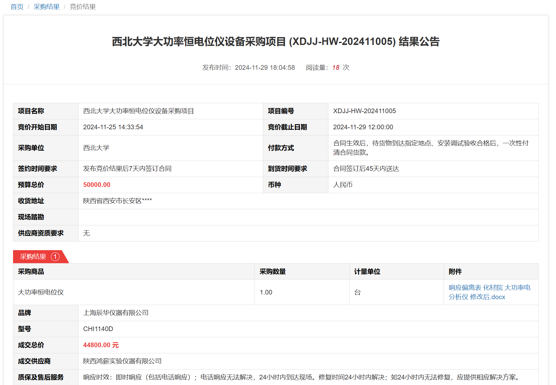 西北大学大功率恒电位仪设备采购项目(XDJJ-HW-202411005)竞价结果公告 作者:采购与招标办公室 编辑: 时间:2024-11-29 原公告链接:https://www.ejingcai.com.cn/site/bidding/detail/15509