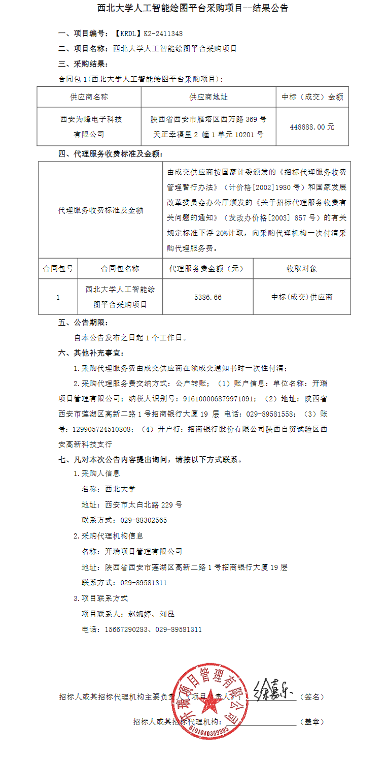 西北大学人工智能绘图平台采购项目结果公告