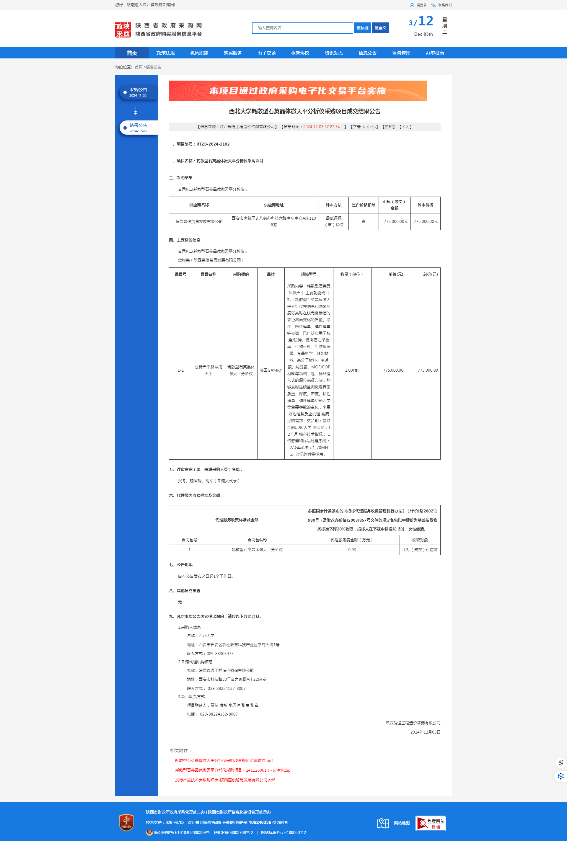 西北大学耗散型石英晶体微天平分析仪采购项目成交结果公告 作者:采购与招标办公室 编辑: 时间:2024-12-03 原公告链接:https://www.ccgp-shaanxi.gov.cn/freecms/site/shaanxi/ggxx/info/2024/8a69c2519218573701938bc3ac1a16c6.html?noticeType=001023¬iceId=6e7b31eb-b15a-11ef-8063-08c0eb20c666