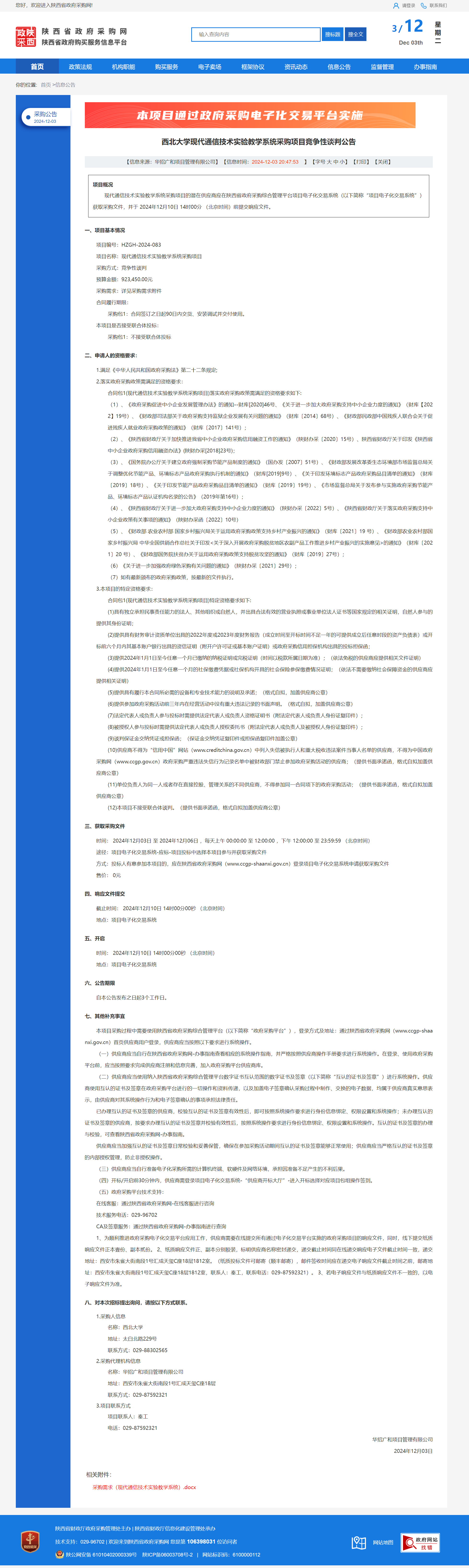 西北大学现代通信技术实验教学系统采购项目竞争性谈判公告