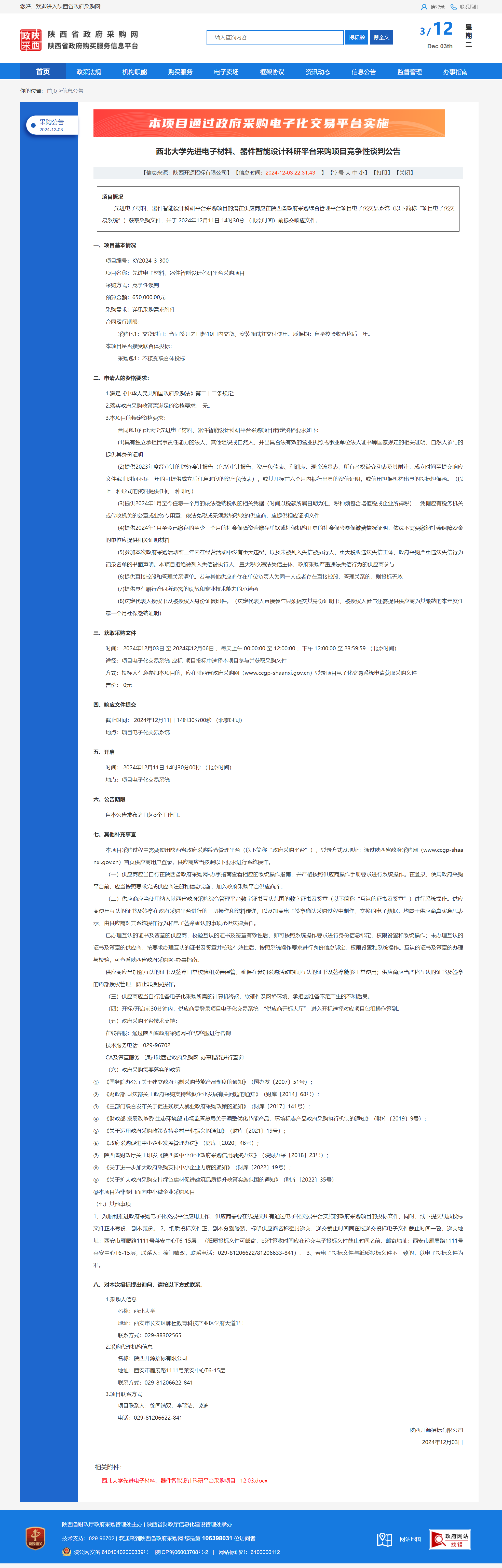 西北大学先进电子材料、器件智能设计科研平台采购项目竞争性谈判公告