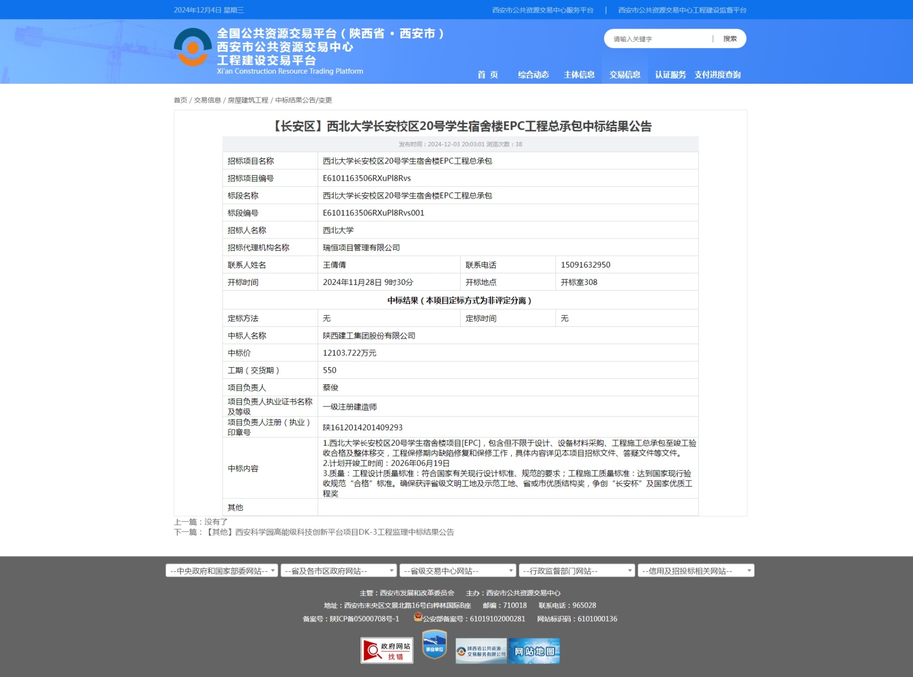 西北大学长安校区20号学生宿舍楼EPC工程总承包中标结果公告