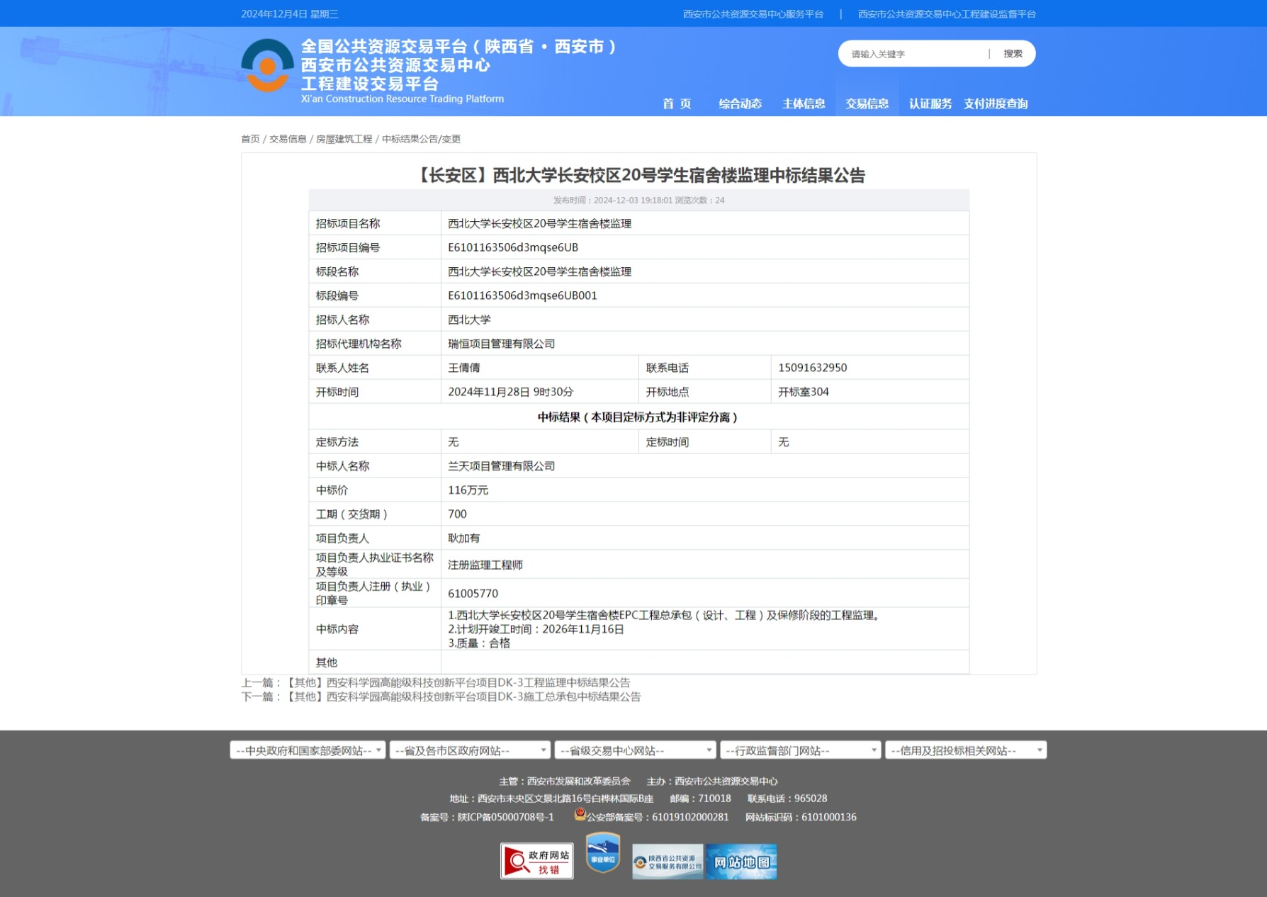 西北大学长安校区20号学生宿舍楼监理中标结果公告