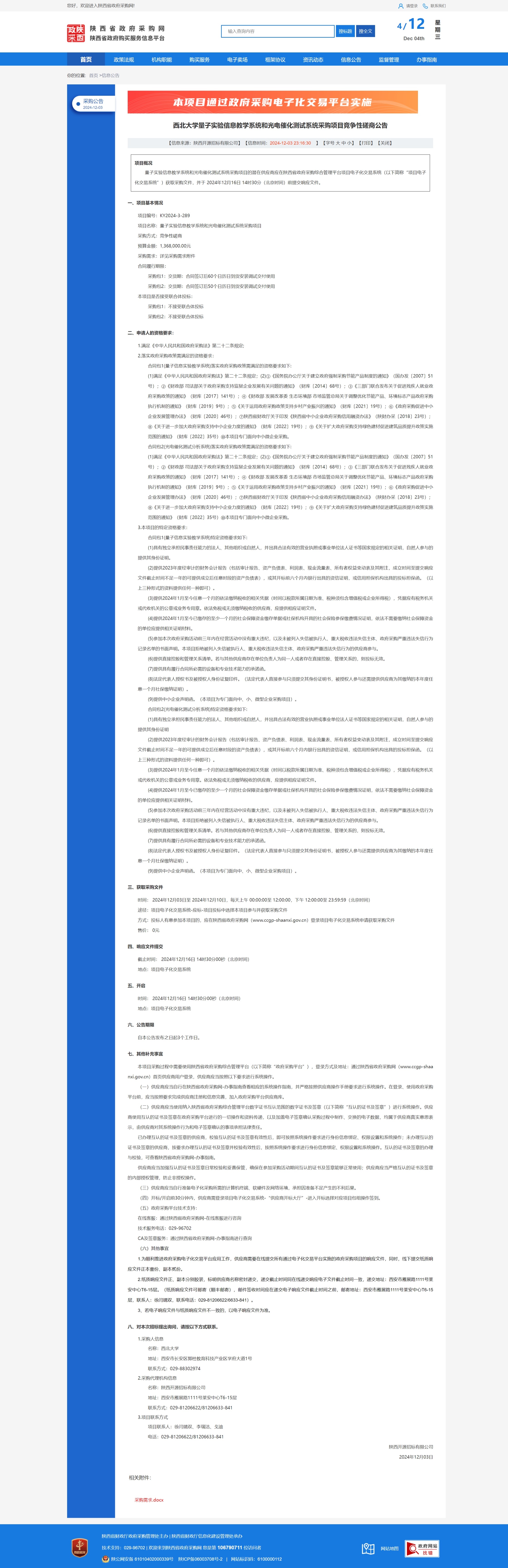 西北大学量子实验信息教学系统和光电催化测试系统采购项目竞争性磋商公告 作者: 编辑:薛利娟 时间:2024-12-04 原公告链接:https://www.ccgp-shaanxi.gov.cn/freecms/site/shaanxi/ggxx/info/2024/8a69c2519218573701938d0b2f6f2d3a.html?noticeType=001016¬iceId=1a520fb1-b1e9-11ef-8063-08c0eb20c666