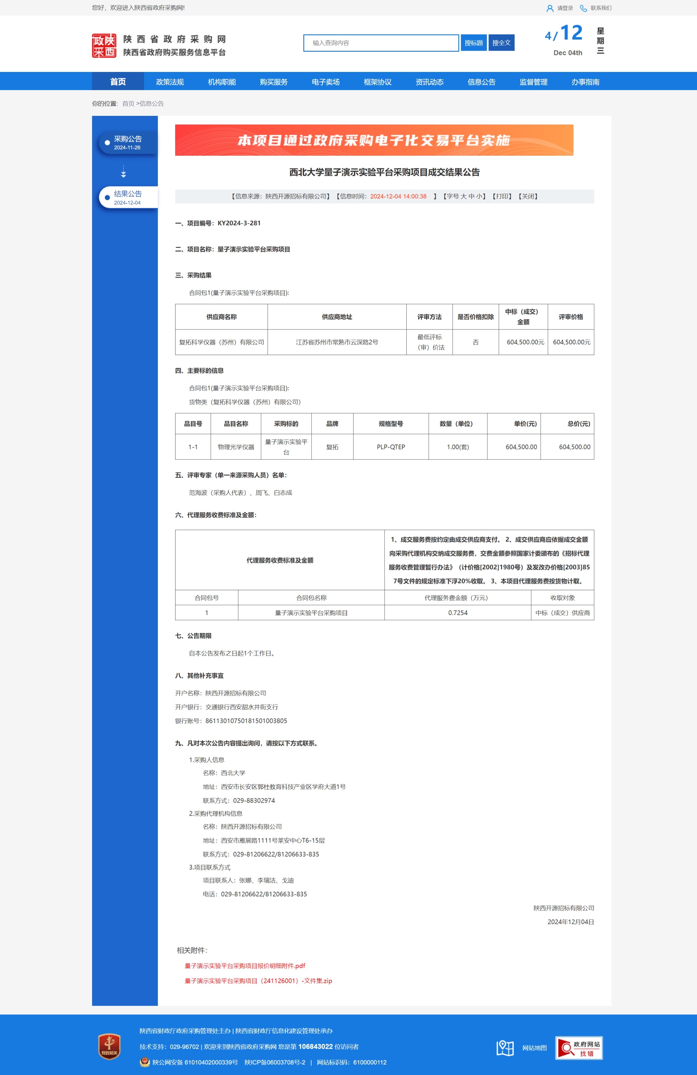 西北大学量子演示实验平台采购项目成交结果公告 作者: 编辑:薛利娟 时间:2024-12-04 原公告链接:https://www.ccgp-shaanxi.gov.cn/freecms/site/shaanxi/ggxx/info/2024/8a69c5a59218576d0193902f6a9a5c54.html?noticeType=001023¬iceId=b0c0bd1b-b206-11ef-8063-08c0eb20c666