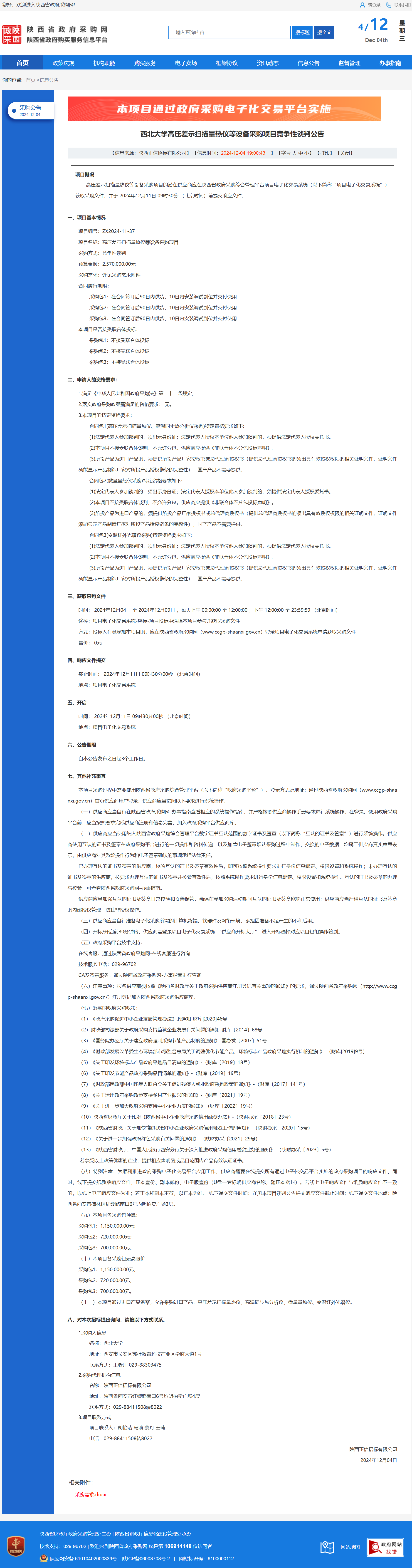 西北大学高压差示扫描量热仪等设备采购项目竞争性谈判公告 作者:采购与招标办公室 编辑: 时间:2024-12-04 原公告链接:https://www.ccgp-shaanxi.gov.cn/freecms/site/shaanxi/ggxx/info/2024/8a69c5a59218576d0193913c35b35476.html?noticeType=001013¬iceId=9d4d6b86-b230-11ef-8063-08c0eb20c666