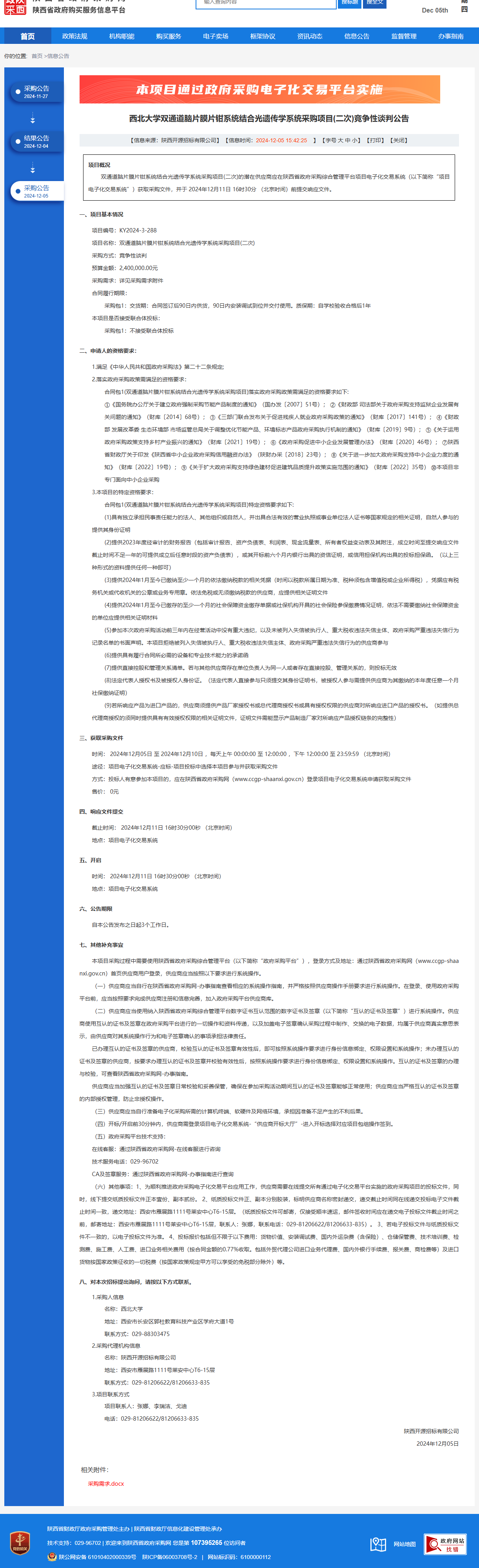 西北大学双通道脑片膜片钳系统结合光遗传学系统采购项目(二次)竞争性谈判公告 作者:采购与招标办公室 编辑: 时间:2024-12-05 原公告链接:https://www.ccgp-shaanxi.gov.cn/freecms/site/shaanxi/ggxx/info/2024/8a69c44e9218572b0193959c7d8f36e5.html?noticeType=001013¬iceId=13c69da8-b2de-11ef-8063-08c0eb20c666