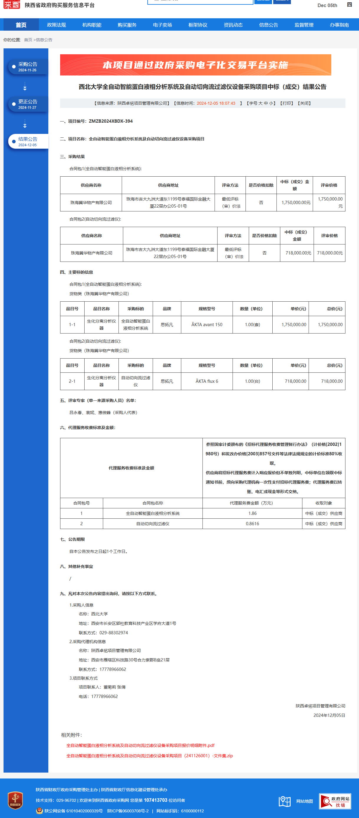 西北大学全自动智能蛋白液相分析系统及自动切向流过滤仪设备采购项目中标(成交)结果公告 作者:采购与招标办公室 编辑: 时间:2024-12-05 原公告链接:https://www.ccgp-shaanxi.gov.cn/freecms/site/shaanxi/ggxx/info/2024/8a69c44e9218572b01939643fffe267c.html?noticeType=001023¬iceId=5fe3fe15-b2f2-11ef-8063-08c0eb20c666