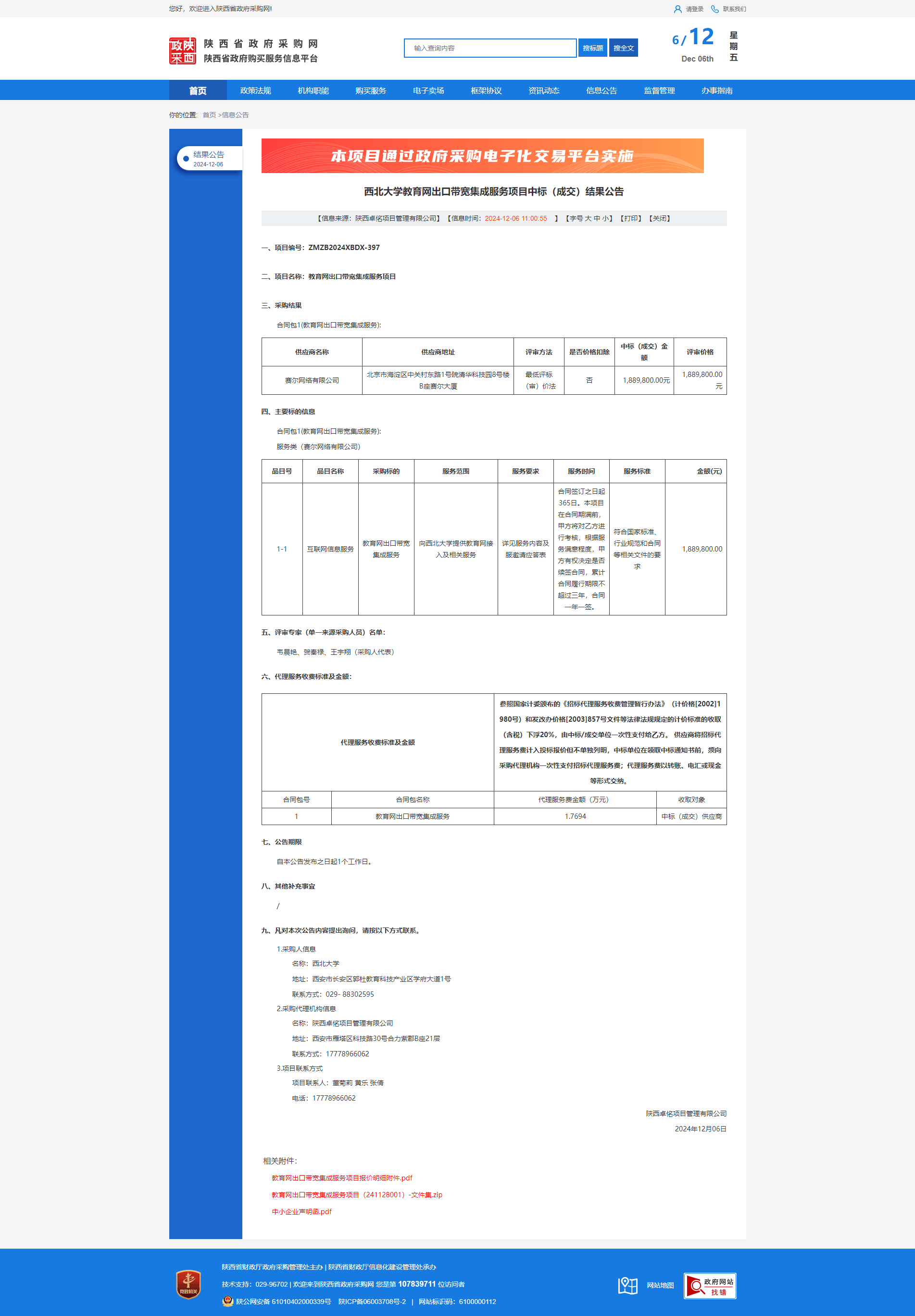西北大学教育网出口带宽集成服务项目中标(成交)结果公告