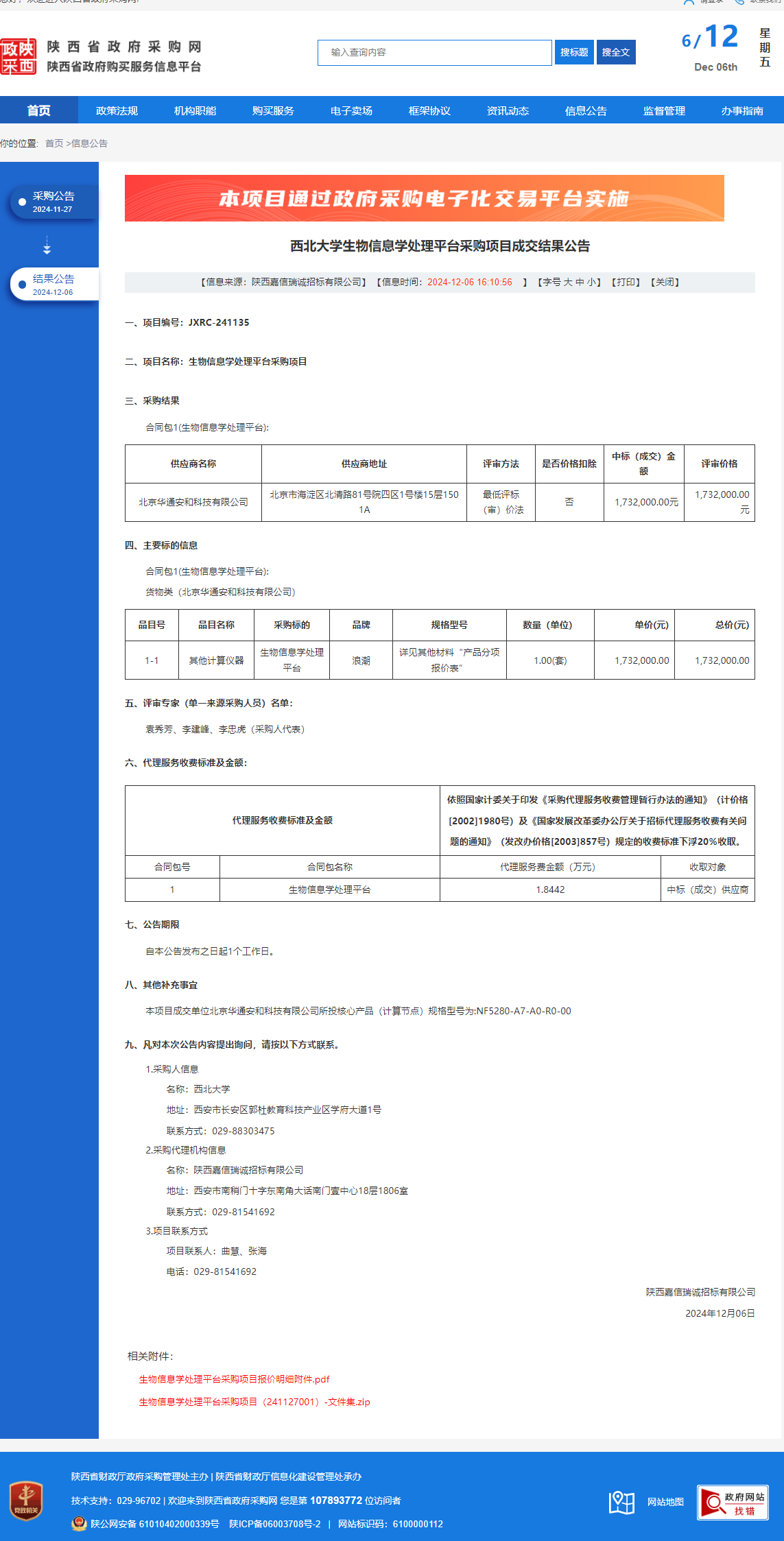 西北大学生物信息学处理平台采购项目成交结果公告 作者:采购与招标办公室 编辑: 时间:2024-12-06 原公告链接:https://www.ccgp-shaanxi.gov.cn/freecms/site/shaanxi/ggxx/info/2024/8a69c5a59218576d01939ab2d6091195.html?noticeType=001023¬iceId=3a640688-b3ab-11ef-8063-08c0eb20c666