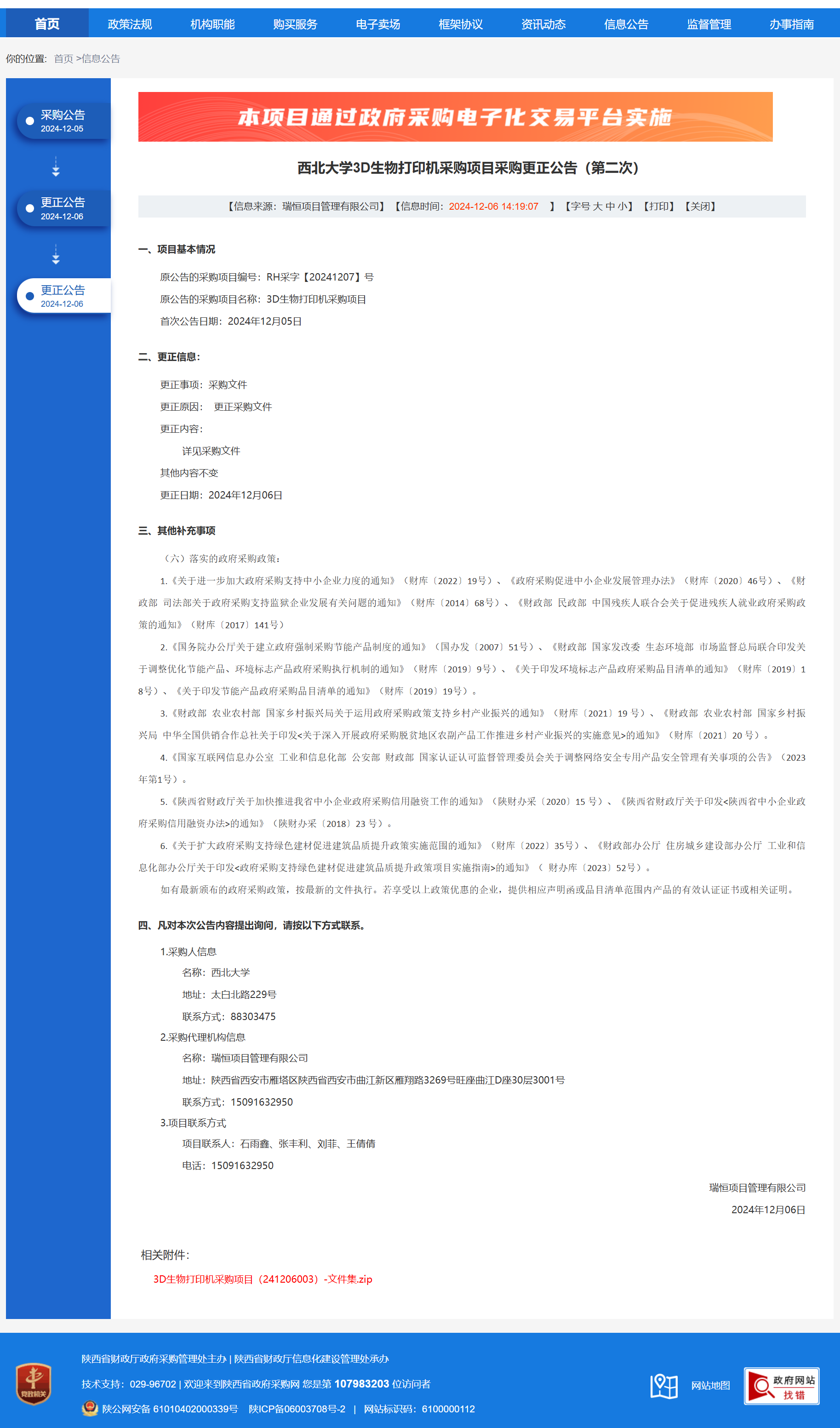 西北大学3D生物打印机采购项目采购更正公告(第二次) 作者:采购与招标办公室 编辑: 时间:2024-12-06 原公告链接:https://www.ccgp-shaanxi.gov.cn/freecms/site/shaanxi/ggxx/info/2024/8a69c5a59218576d01939a447c2a1448.html?noticeType=001031¬iceId=9bb5c25d-b39b-11ef-8063-08c0eb20c666