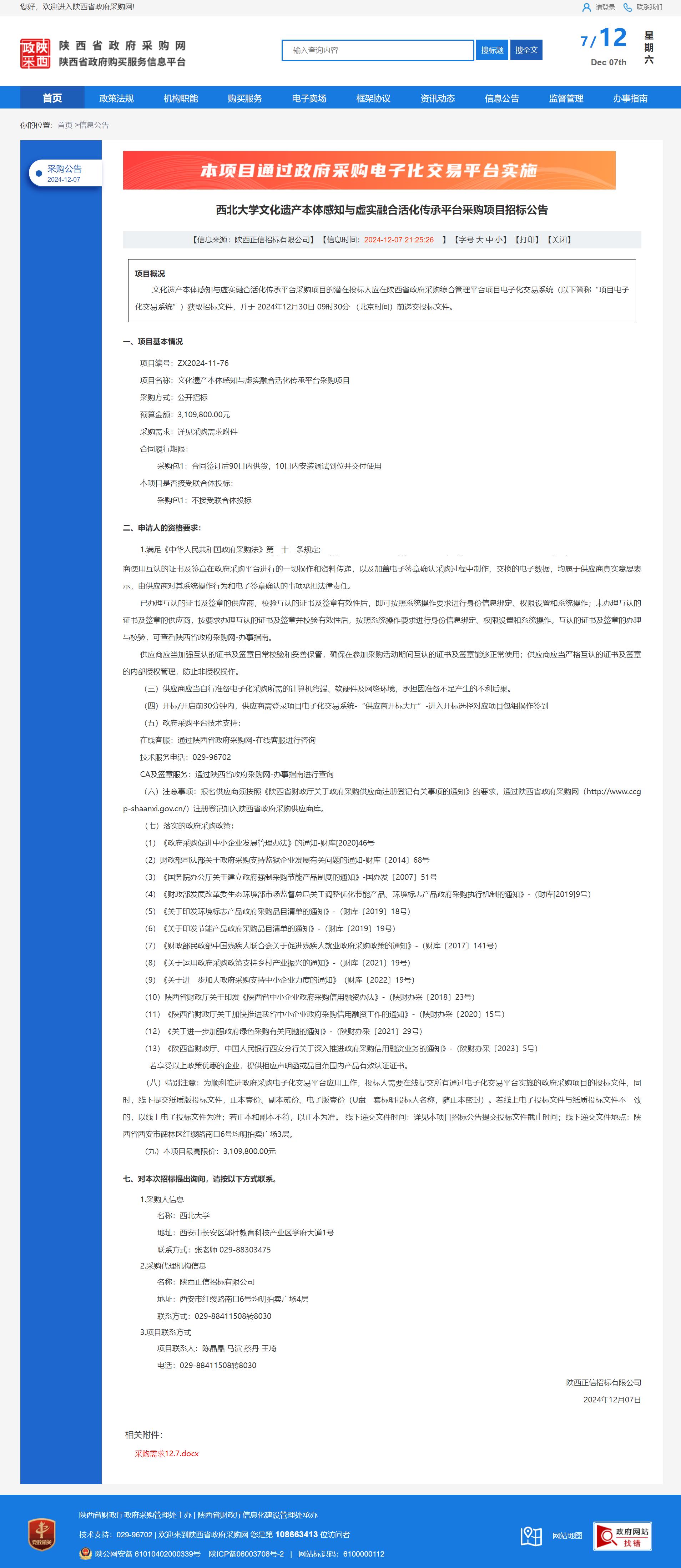 西北大学文化遗产本体感知与虚实融合活化传承平台采购项目招标公告
