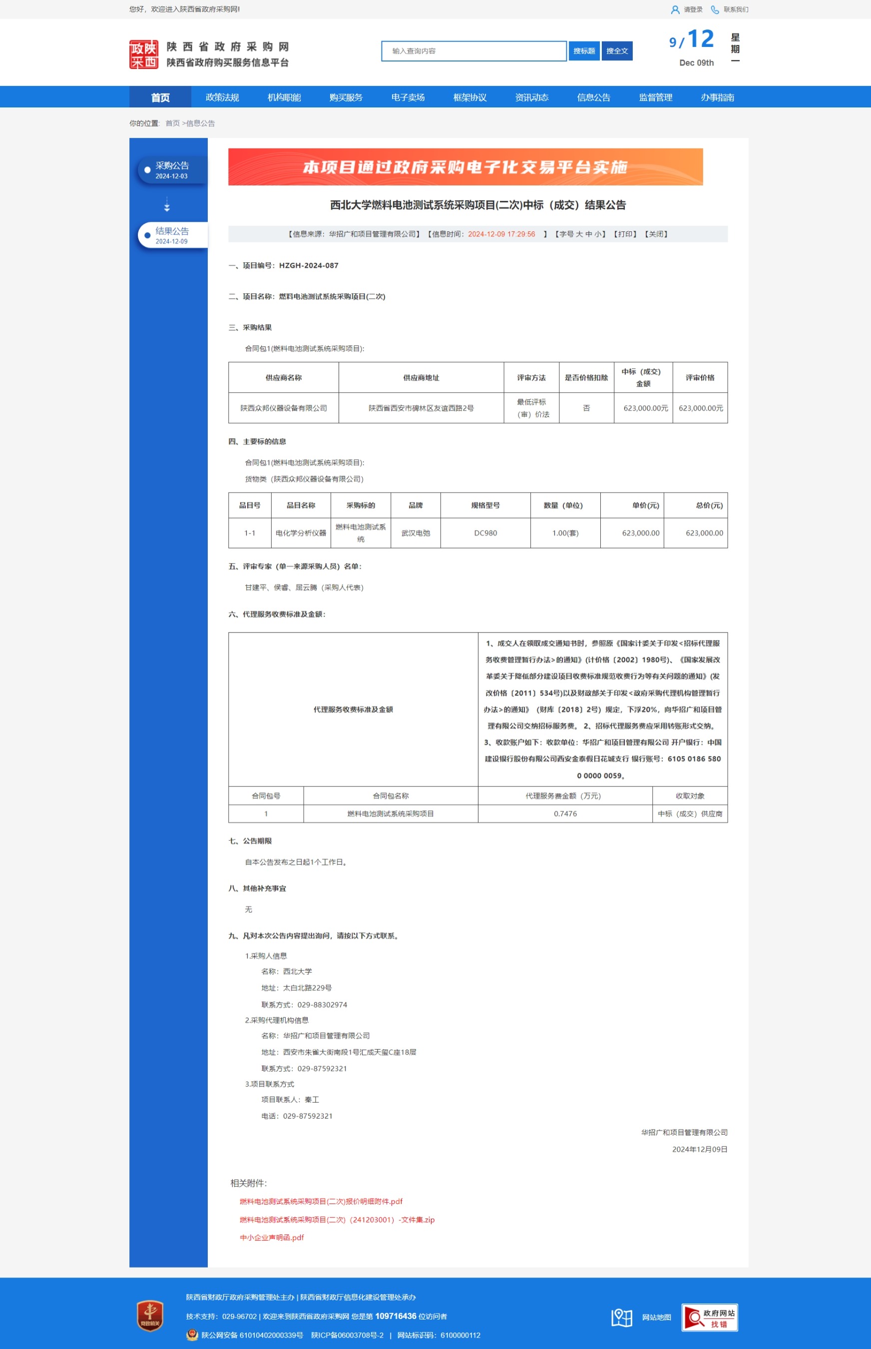 西北大学燃料电池测试系统采购项目(二次)中标(成交)结果公告 作者: 编辑:薛利娟 时间:2024-12-09 原公告链接:https://www.ccgp-shaanxi.gov.cn/freecms/site/shaanxi/ggxx/info/2024/8a69c95d921859f00193aa9e7adf495f.html?noticeType=001023¬iceId=c4aa581b-b611-11ef-8063-08c0eb20c666
