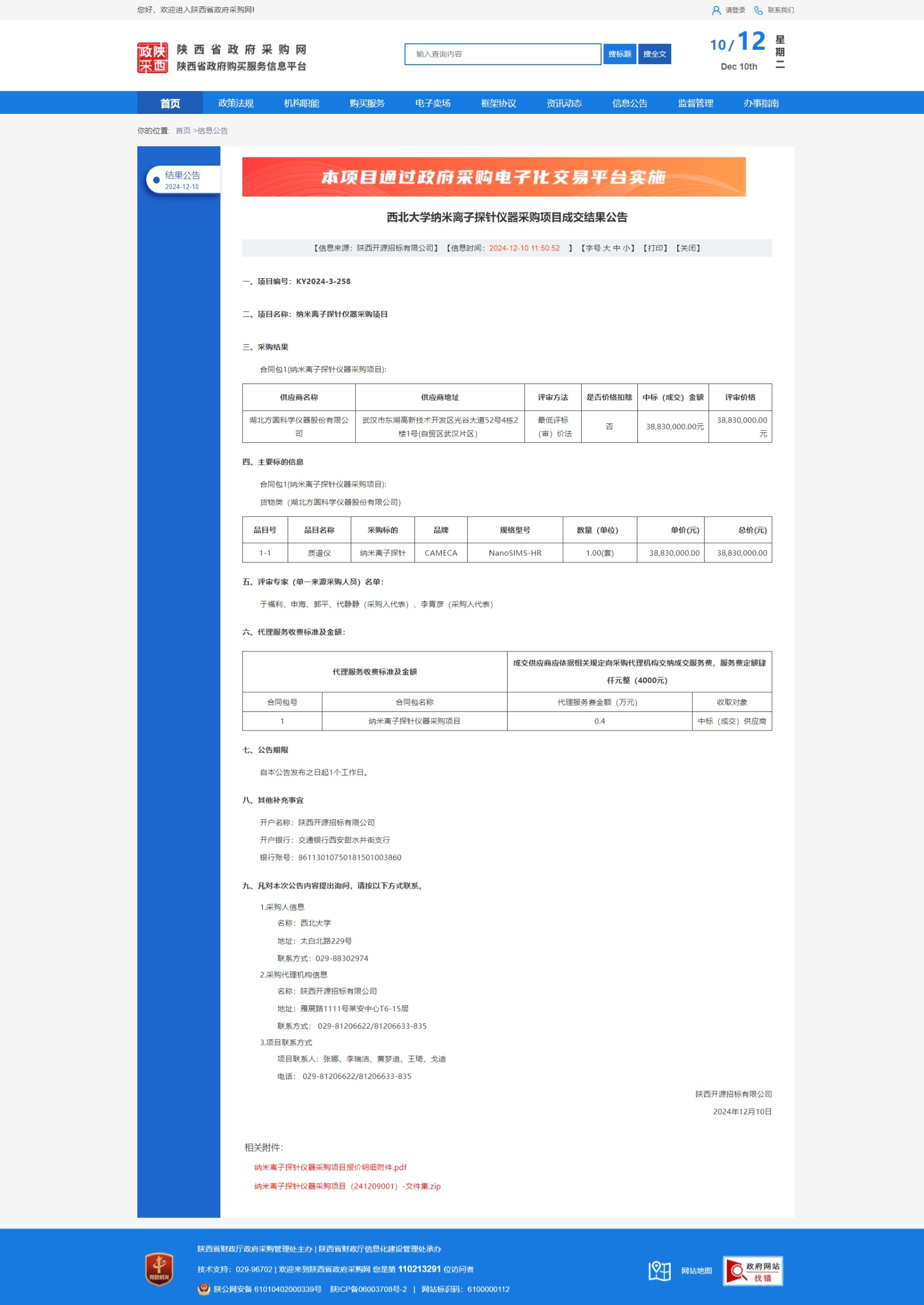 西北大学纳米离子探针仪器采购项目成交结果公告 作者: 编辑:薛利娟 时间:2024-12-10 原公告链接:https://www.ccgp-shaanxi.gov.cn/freecms/site/shaanxi/ggxx/info/2024/8a69c5a59218576d0193aea3717402eb.html?noticeType=001025¬iceId=917c05e9-b6ab-11ef-8063-08c0eb20c666