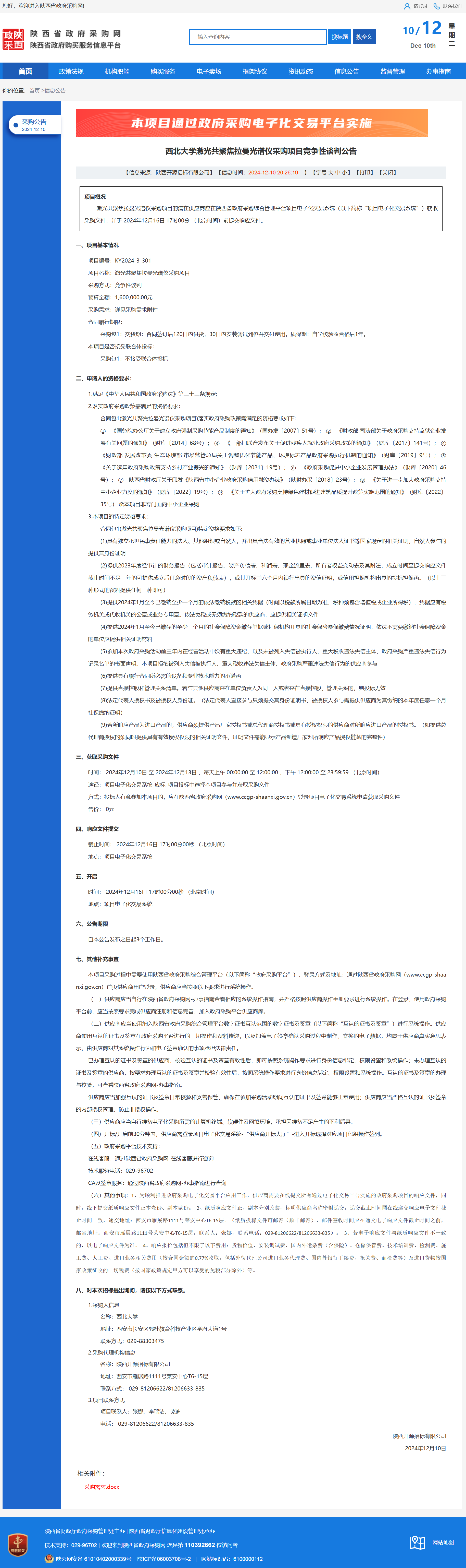 西北大学激光共聚焦拉曼光谱仪采购项目竞争性谈判公告 作者:采购与招标办公室 编辑: 时间:2024-12-10 原公告链接:https://www.ccgp-shaanxi.gov.cn/freecms/site/shaanxi/ggxx/info/2024/8a69c5a59218576d0193b081eb986c20.html?noticeType=001013¬iceId=937b25d9-b6f3-11ef-8063-08c0eb20c666