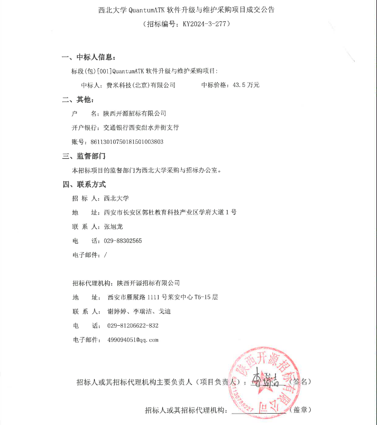 西北大学QuantumATK软件升级与维护采购项目成交公告