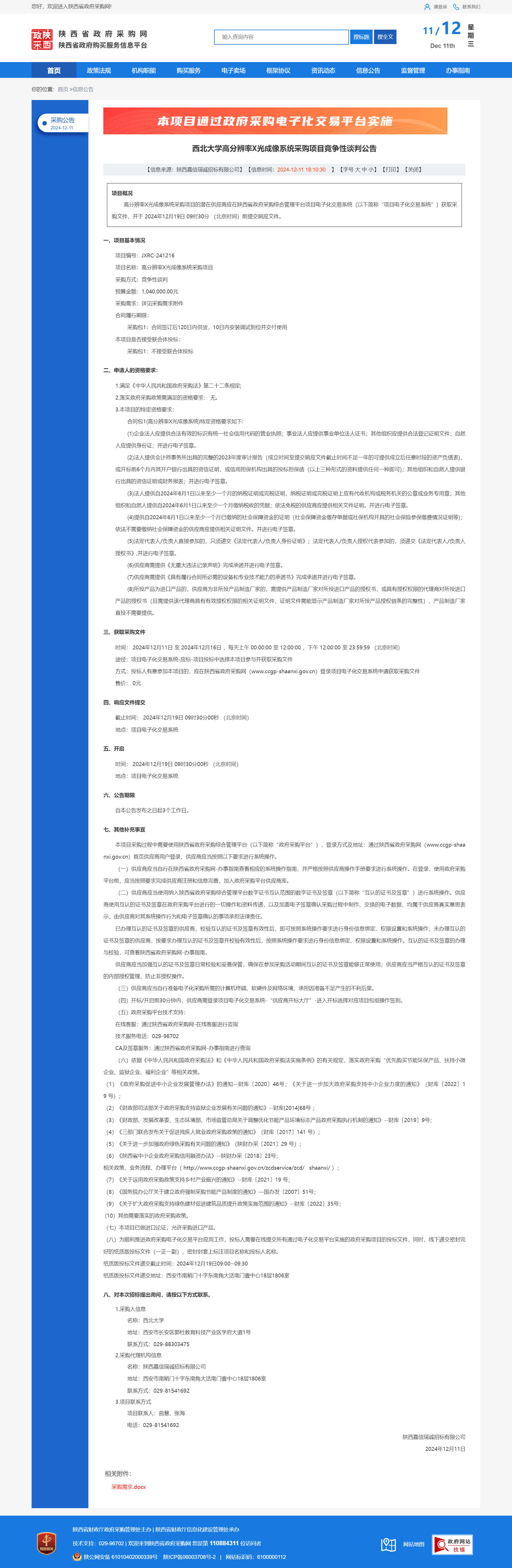 西北大学高分辨率X光成像系统采购项目竞争性谈判公告 作者:采购与招标办公室 编辑: 时间:2024-12-11 原公告链接:https://www.ccgp-shaanxi.gov.cn/freecms/site/shaanxi/ggxx/info/2024/8a69c251921857370193b5010b9638d3.html?noticeType=001013¬iceId=c4fa68de-b7a9-11ef-8063-08c0eb20c666