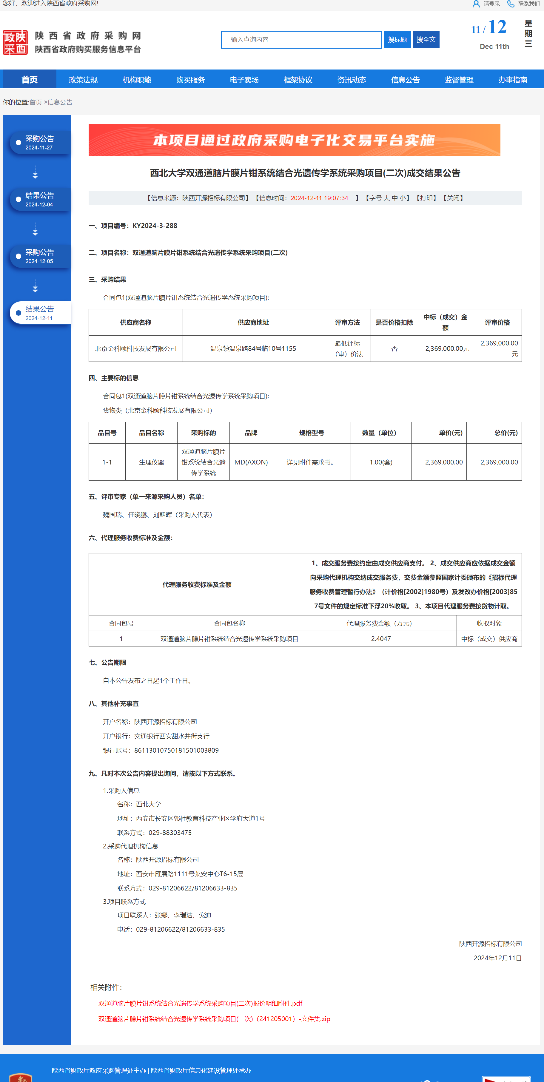 西北大学双通道脑片膜片钳系统结合光遗传学系统采购项目(二次)成交结果公告 作者:采购与招标办公室 编辑: 时间:2024-12-11 原公告链接:https://www.ccgp-shaanxi.gov.cn/freecms/site/shaanxi/ggxx/info/2024/8a69c5a59218576d0193b551fa0d60e2.html?noticeType=001023¬iceId=be41a2eb-b7b1-11ef-8063-08c0eb20c666