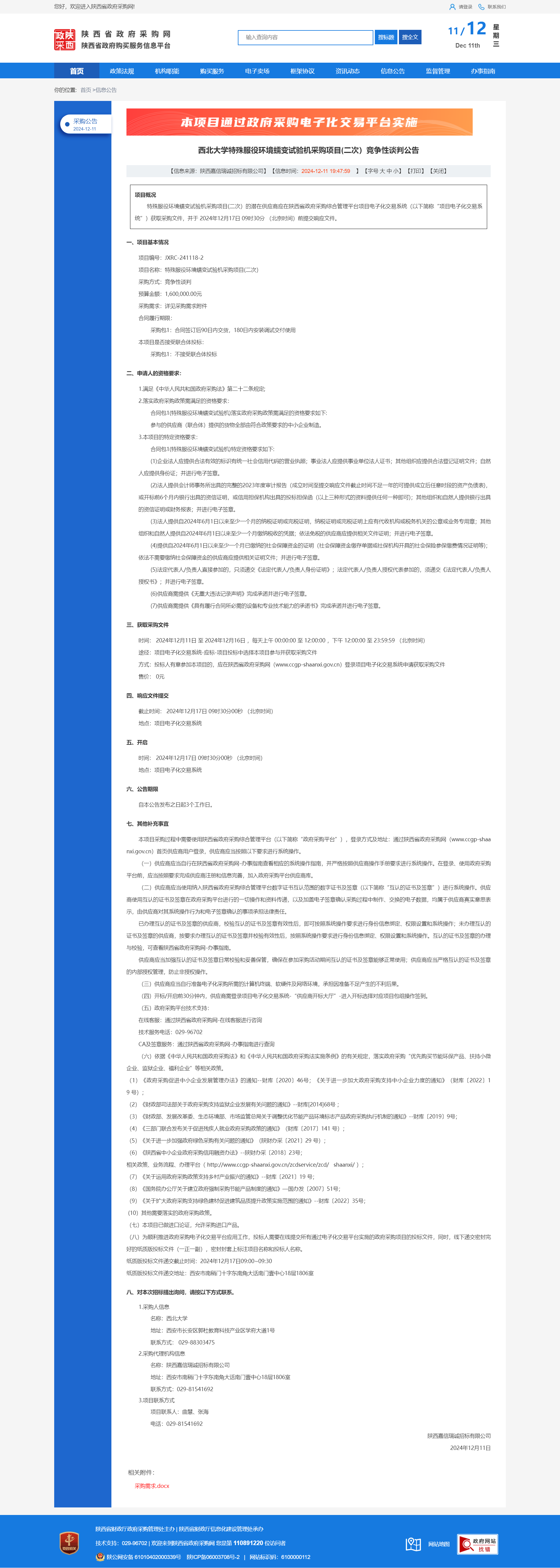西北大学特殊服役环境蠕变试验机采购项目(二次)竞争性谈判公告 作者:采购与招标办公室 编辑: 时间:2024-12-11 原公告链接:https://www.ccgp-shaanxi.gov.cn/freecms/site/shaanxi/ggxx/info/2024/8a69c5a59218576d0193b572f0492761.html?noticeType=001013¬iceId=632dd20f-b7b7-11ef-8063-08c0eb20c666