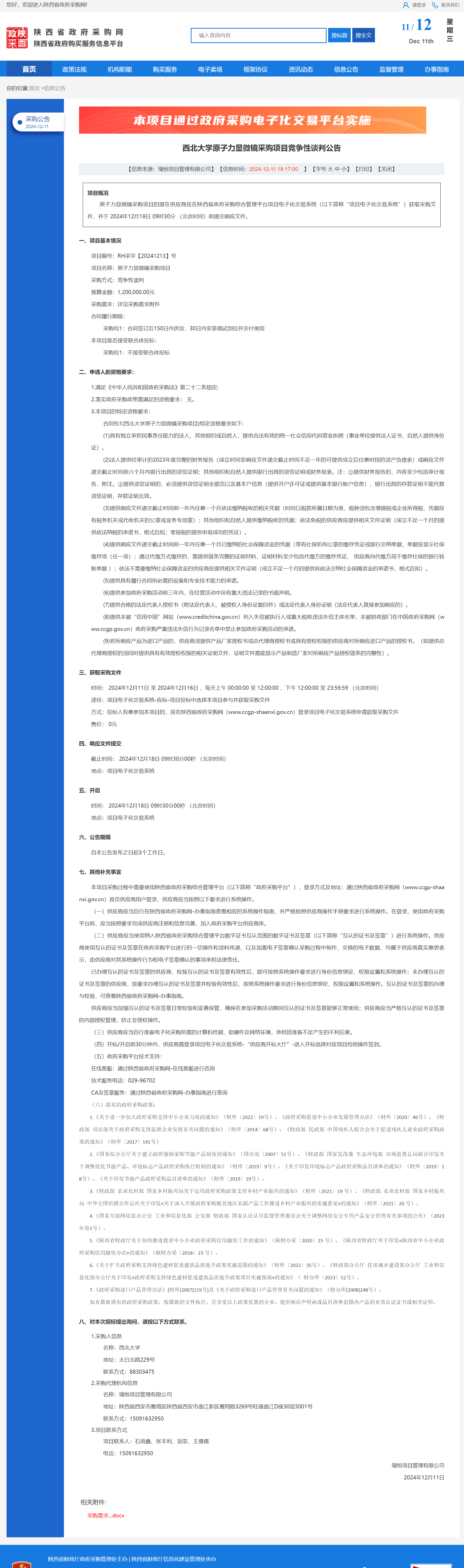 西北大学原子力显微镜采购项目竞争性谈判公告 作者:采购与招标办公室 编辑: 时间:2024-12-11 原公告链接:http://www.ccgp-shaanxi.gov.cn/freecms/site/shaanxi/ggxx/info/2024/8a69c251921857370193b52d521644e4.html?noticeType=001013¬iceId=ad5ee099-b7aa-11ef-8063-08c0eb20c666