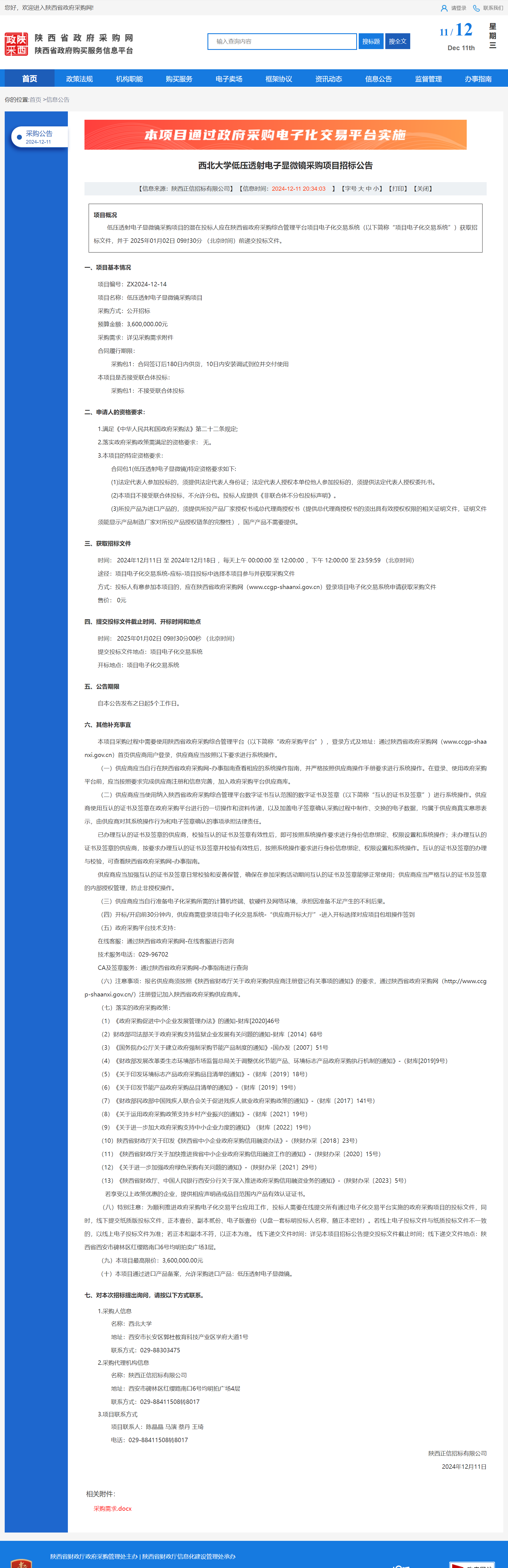 西北大学低压透射电子显微镜采购项目招标公告 作者:采购与招标办公室 编辑: 时间:2024-12-11 原公告链接:https://www.ccgp-shaanxi.gov.cn/freecms/site/shaanxi/ggxx/info/2024/8a69c251921857370193b58a2eef18ef.html?noticeType=001011¬iceId=d31c6b03-b7bd-11ef-8063-08c0eb20c666