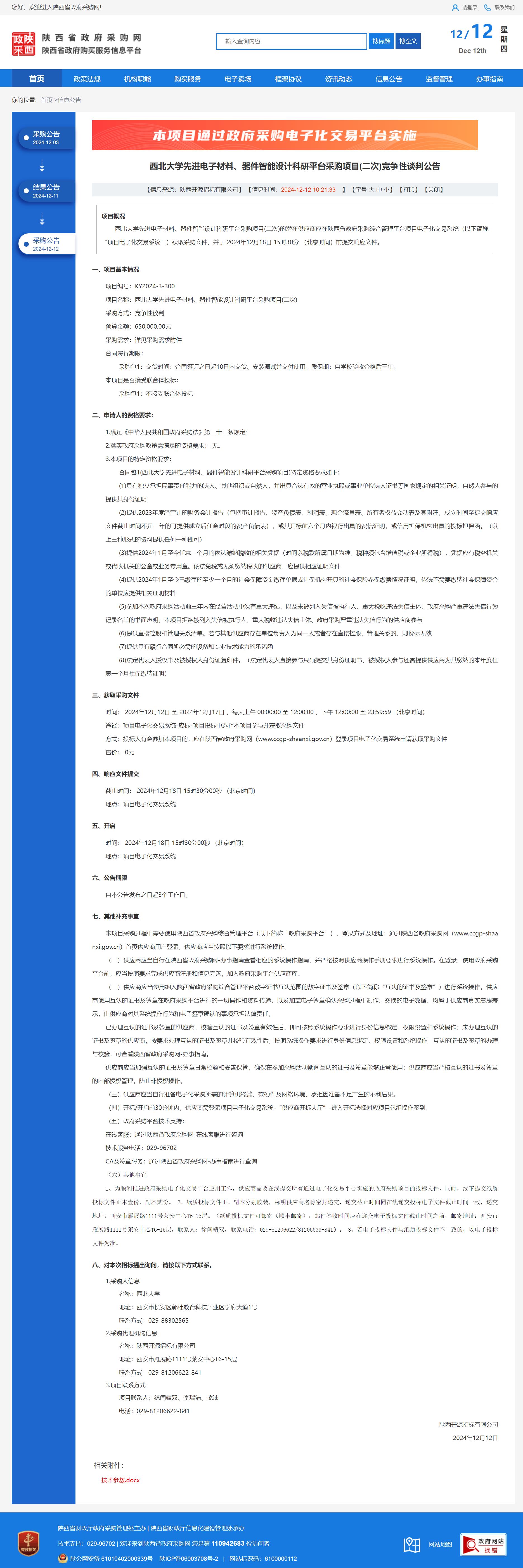 西北大学先进电子材料、器件智能设计科研平台采购项目(二次)竞争性谈判公告