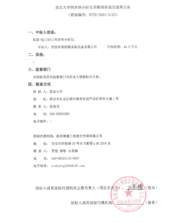 西北大学同步热分析仪采购项目成交结果公告
