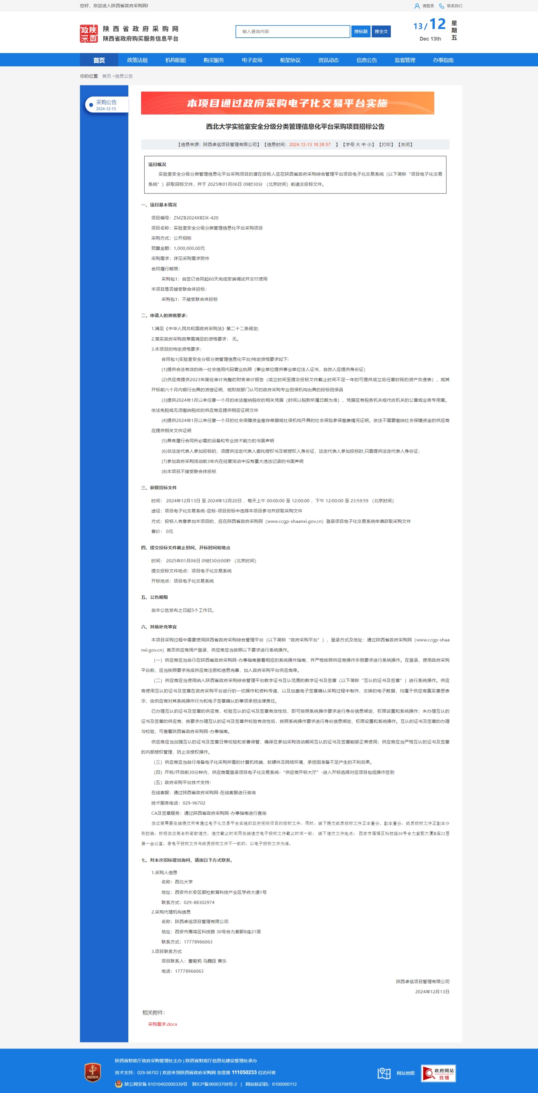 西北大学实验室安全分级分类管理信息化平台采购项目招标公告 作者: 编辑:采购与招标办公室 时间:2024-12-13 原公告链接:https://www.ccgp-shaanxi.gov.cn/freecms/site/shaanxi/ggxx/info/2024/8a69c95d921859f00193bf116d567355.html?noticeType=001011¬iceId=a3767776-b92d-11ef-8063-08c0eb20c666