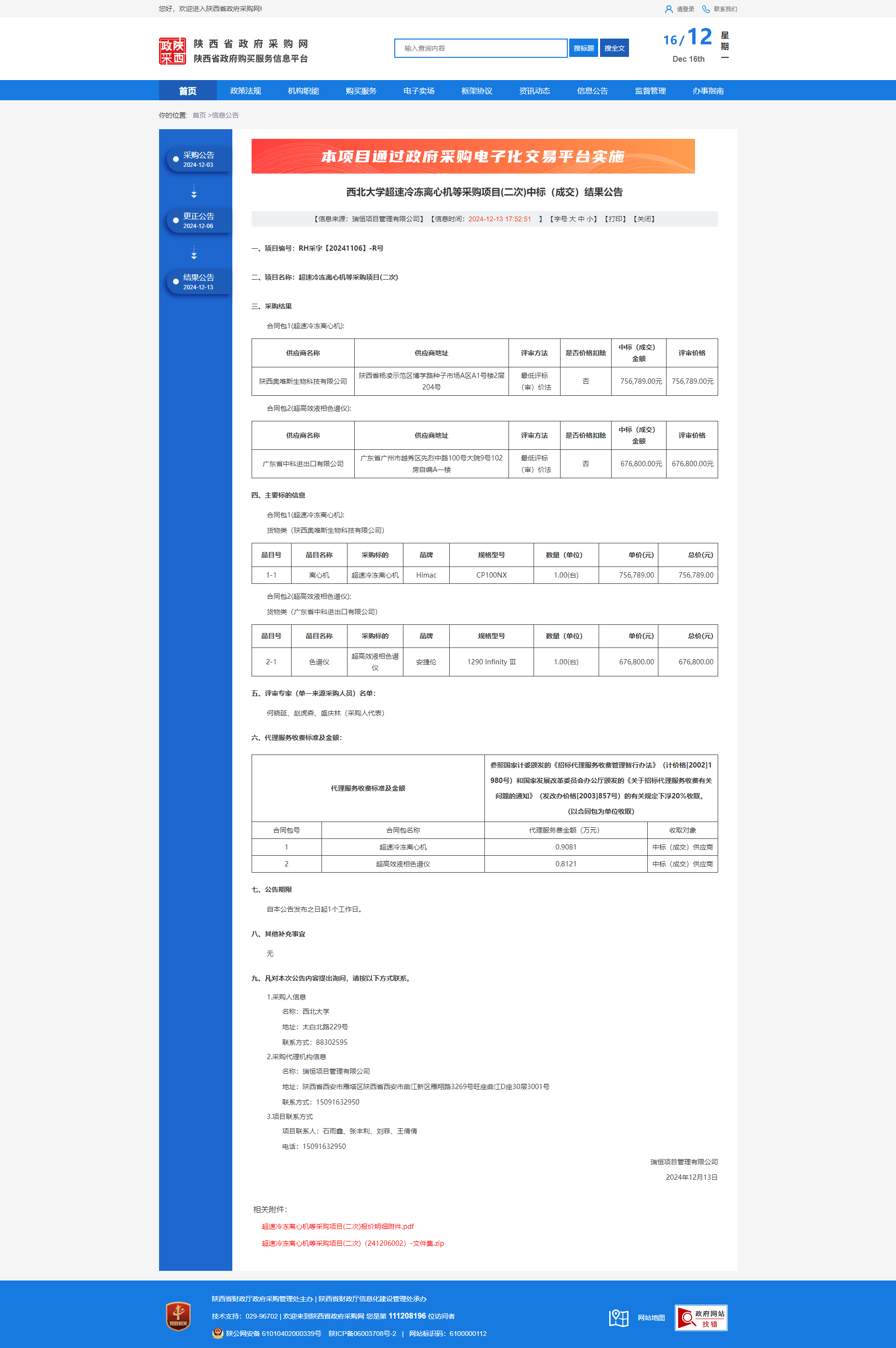 西北大学超速冷冻离心机等采购项目(二次)中标(成交)结果公告
