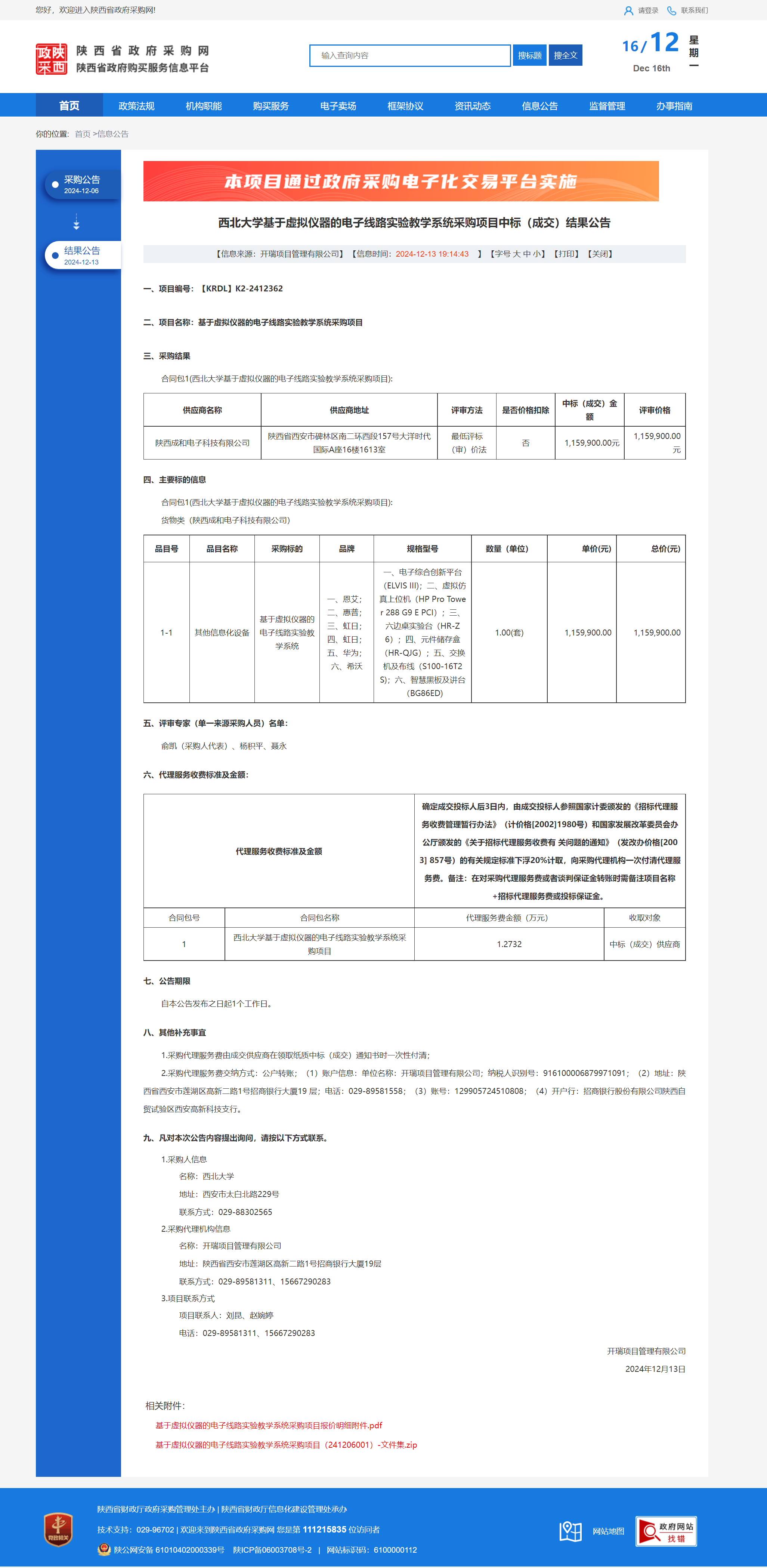 西北大学基于虚拟仪器的电子线路实验教学系统采购项目中标(成交)结果公告