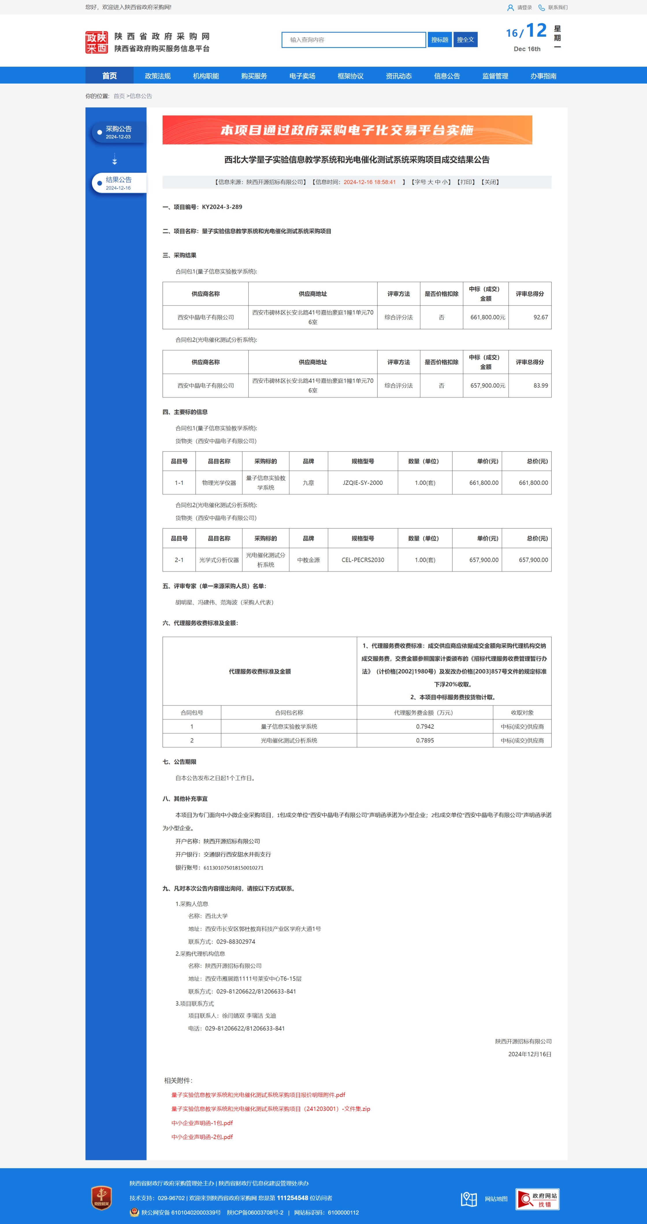 西北大学量子实验信息教学系统和光电催化测试系统采购项目成交结果公告 作者: 编辑:薛利娟 时间:2024-12-16 原公告链接:https://www.ccgp-shaanxi.gov.cn/freecms/site/shaanxi/ggxx/info/2024/8a69c251921857370193cef385563c31.html?noticeType=001026¬iceId=56e31f18-bb9e-11ef-8063-08c0eb20c666