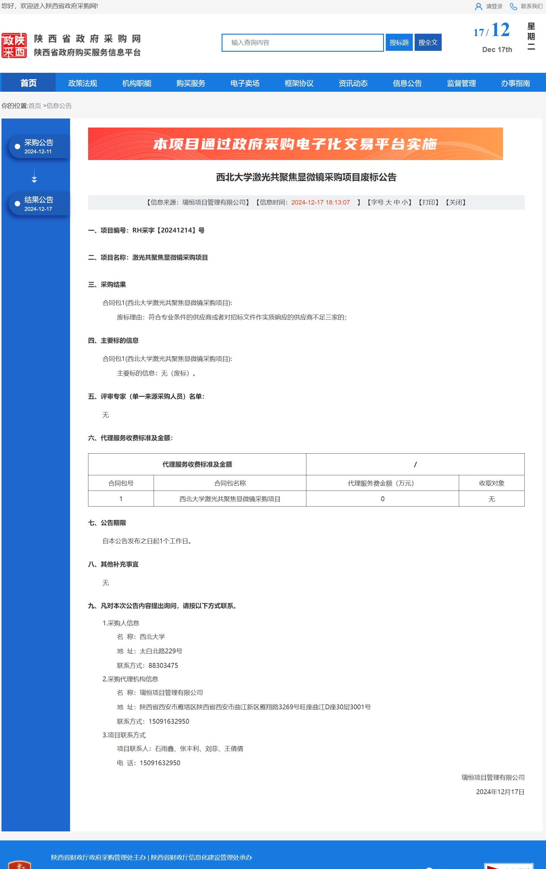 西北大学激光共聚焦显微镜采购项目废标公告 作者:采购与招标办公室 编辑: 时间:2024-12-17 原公告链接:https://www.ccgp-shaanxi.gov.cn/freecms/site/shaanxi/ggxx/info/2024/8a69c5a59218576d0193d411ecee4f38.html
