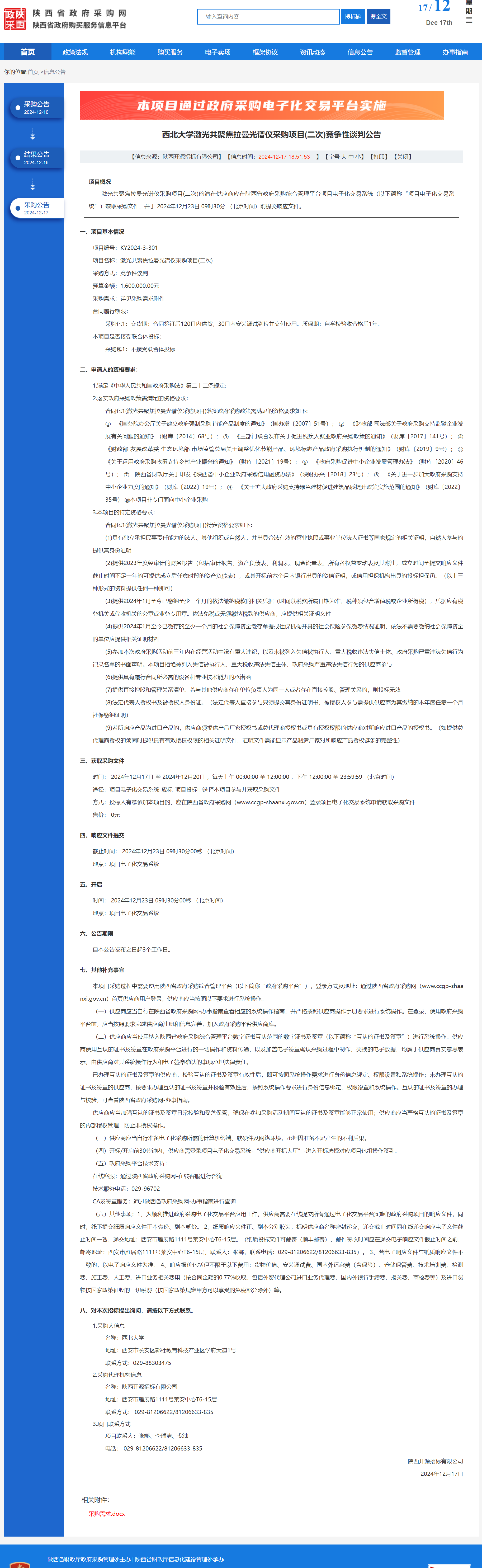 西北大学激光共聚焦拉曼光谱仪采购项目(二次)竞争性谈判公告 作者:采购与招标办公室 编辑: 时间:2024-12-17 原公告链接:https://www.ccgp-shaanxi.gov.cn/freecms/site/shaanxi/ggxx/info/2024/8a69c44e9218572b0193d434f6c730a9.html?noticeType=001013¬iceId=8ed4237e-bc66-11ef-8063-08c0eb20c666