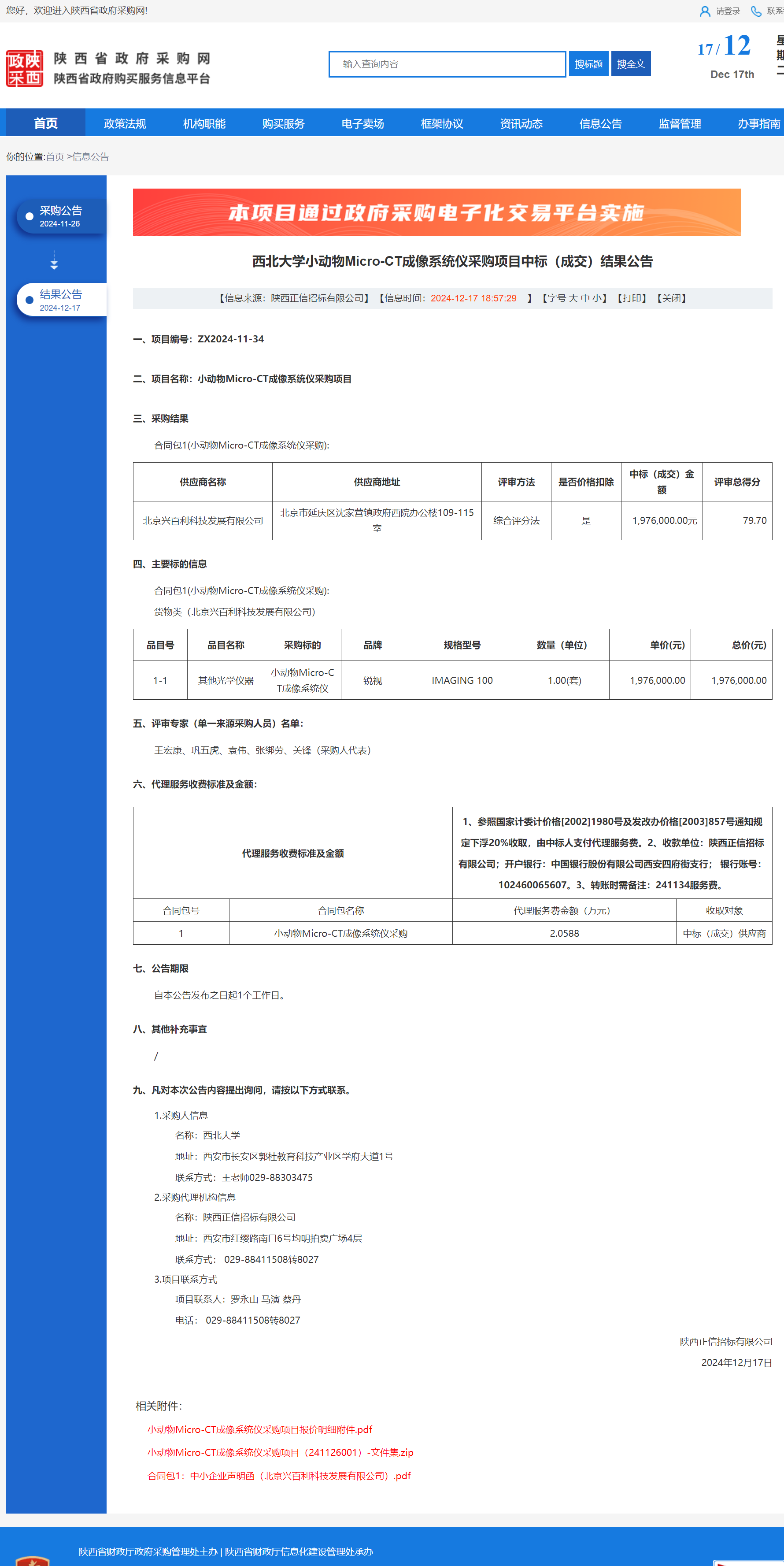 西北大学小动物Micro-CT成像系统仪采购项目中标(成交)结果公告 作者:采购与招标办公室 编辑: 时间:2024-12-17 原公告链接:https://www.ccgp-shaanxi.gov.cn/freecms/site/shaanxi/ggxx/info/2024/8a69c44e9218572b0193d4033f7641ea.html?noticeType=001021¬iceId=56a58cac-bc67-11ef-8063-08c0eb20c666
