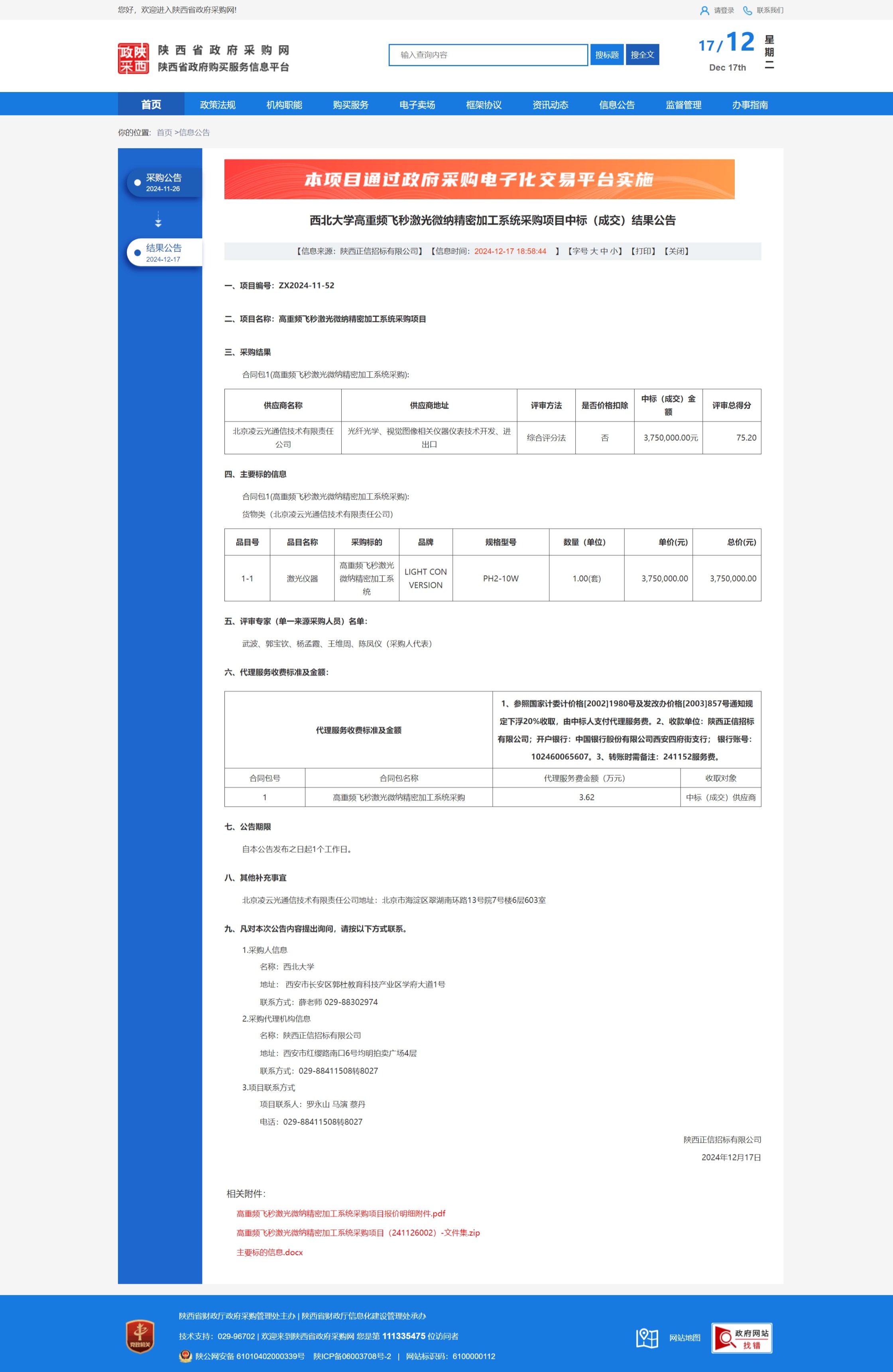 西北大学高重频飞秒激光微纳精密加工系统采购项目中标(成交)结果公告 作者: 编辑:薛利娟 时间:2024-12-17 原公告链接:https://www.ccgp-shaanxi.gov.cn/freecms/site/shaanxi/ggxx/info/2024/8a69c5a59218576d0193d406a33d2ff9.html?noticeType=001021¬iceId=834ffe08-bc67-11ef-8063-08c0eb20c666