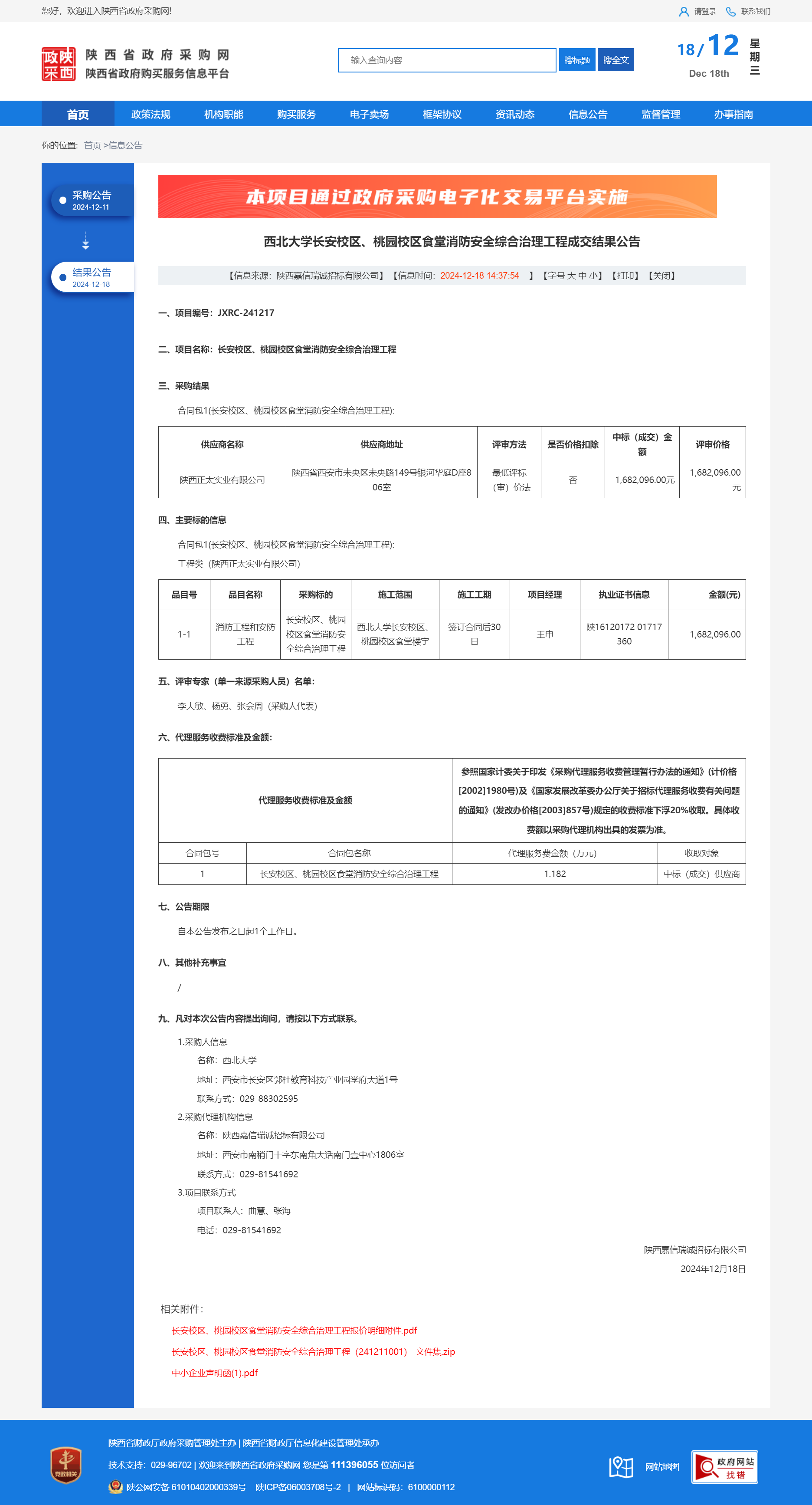 西北大学长安校区、桃园校区食堂消防安全综合治理工程成交结果公告